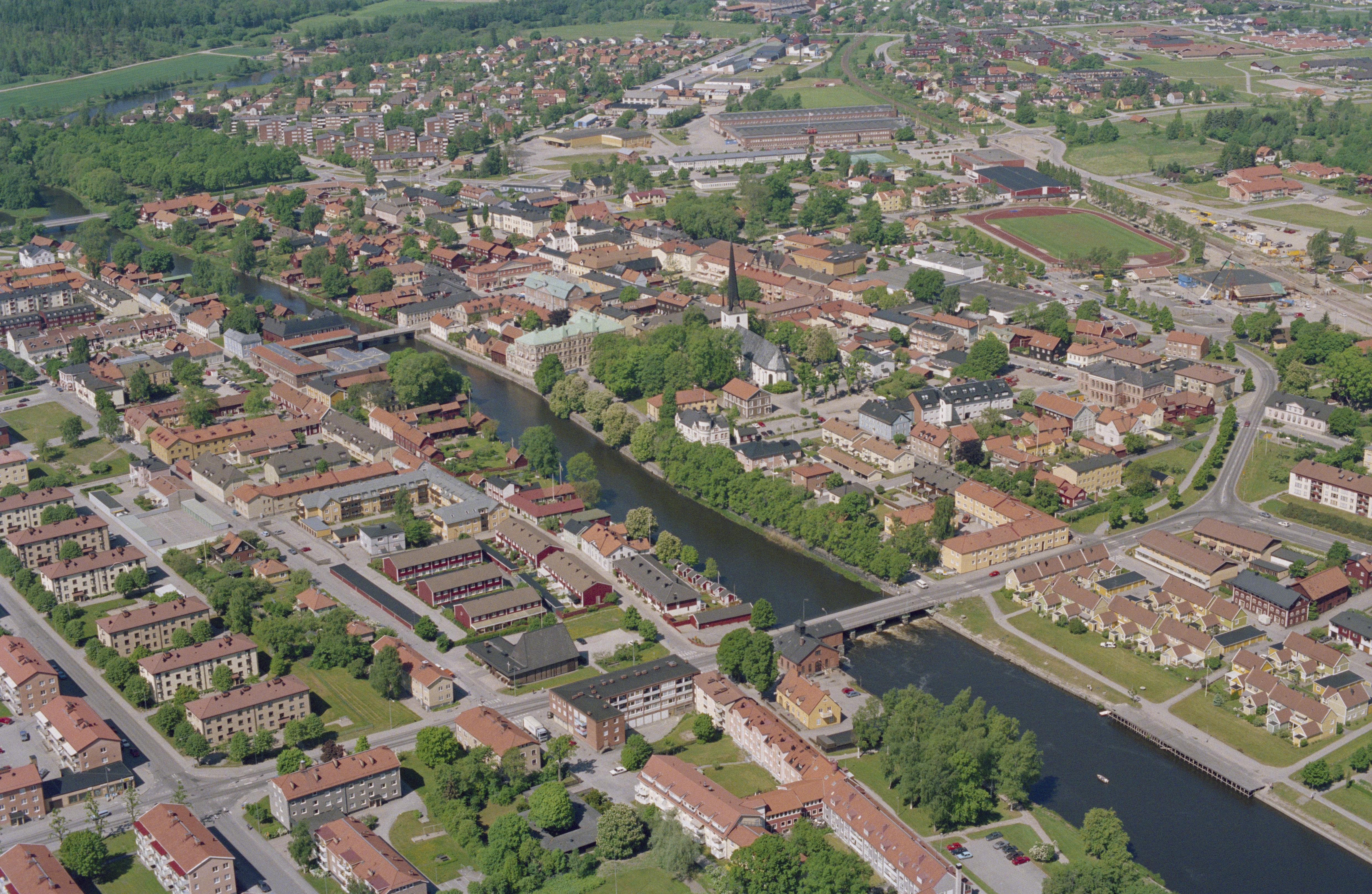 Beskrivning: Arboga stad vid Arbogaån. Heliga Trefaldighetskyrka i stadslager RAÄnr Arboga stad 34:1 i bildens mitt. Bilden är tagen mot (väderstreck): NV