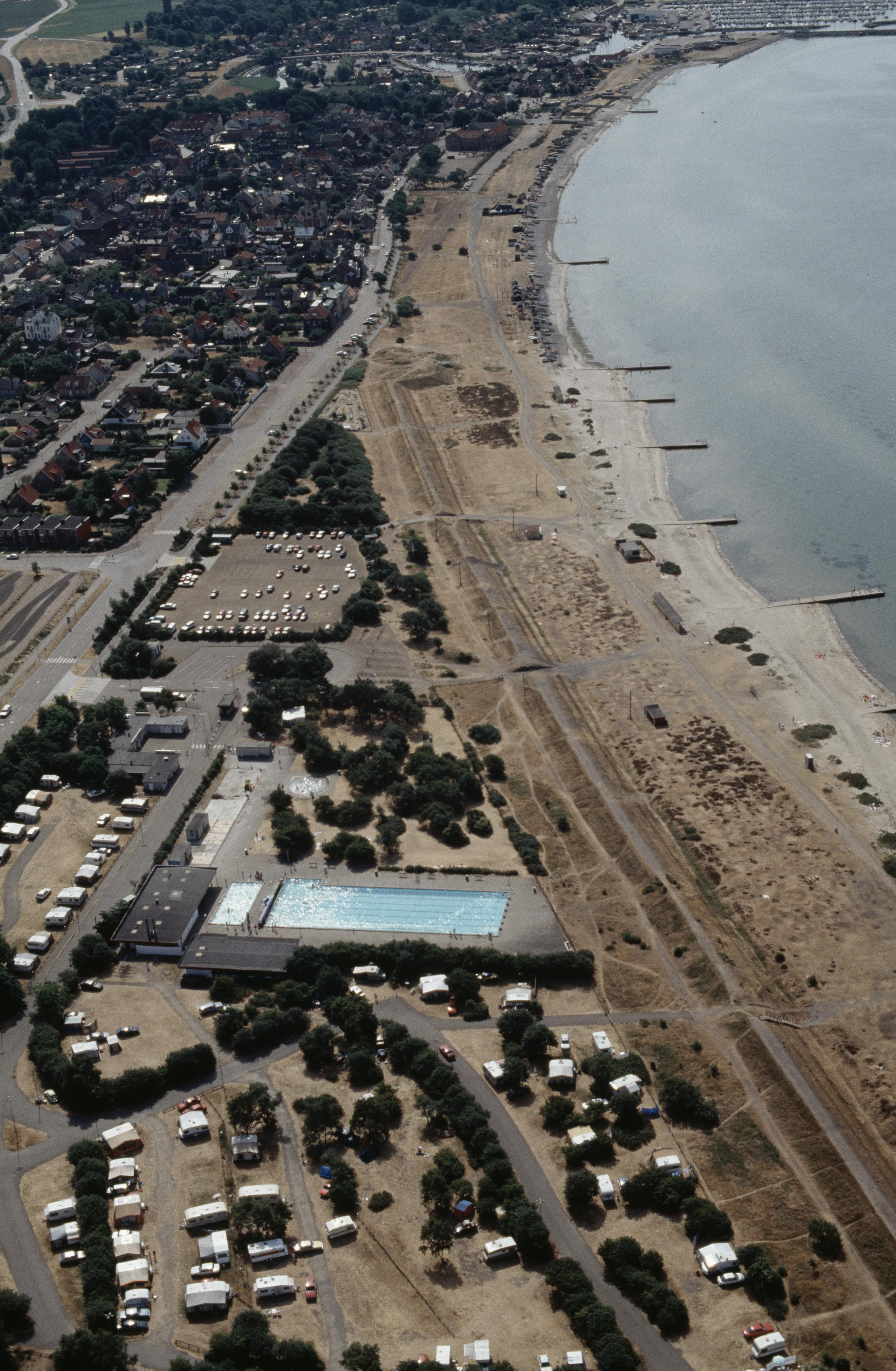 Beskrivning: (Tidigare Raus socken). Campingplats, badplats. Råå vallar RAÄnr Helsingborg 92:1 vid stranden. I bildens övre del Råå-åns utflöde i Öresund. Bilden är tagen mot (väderstreck): S