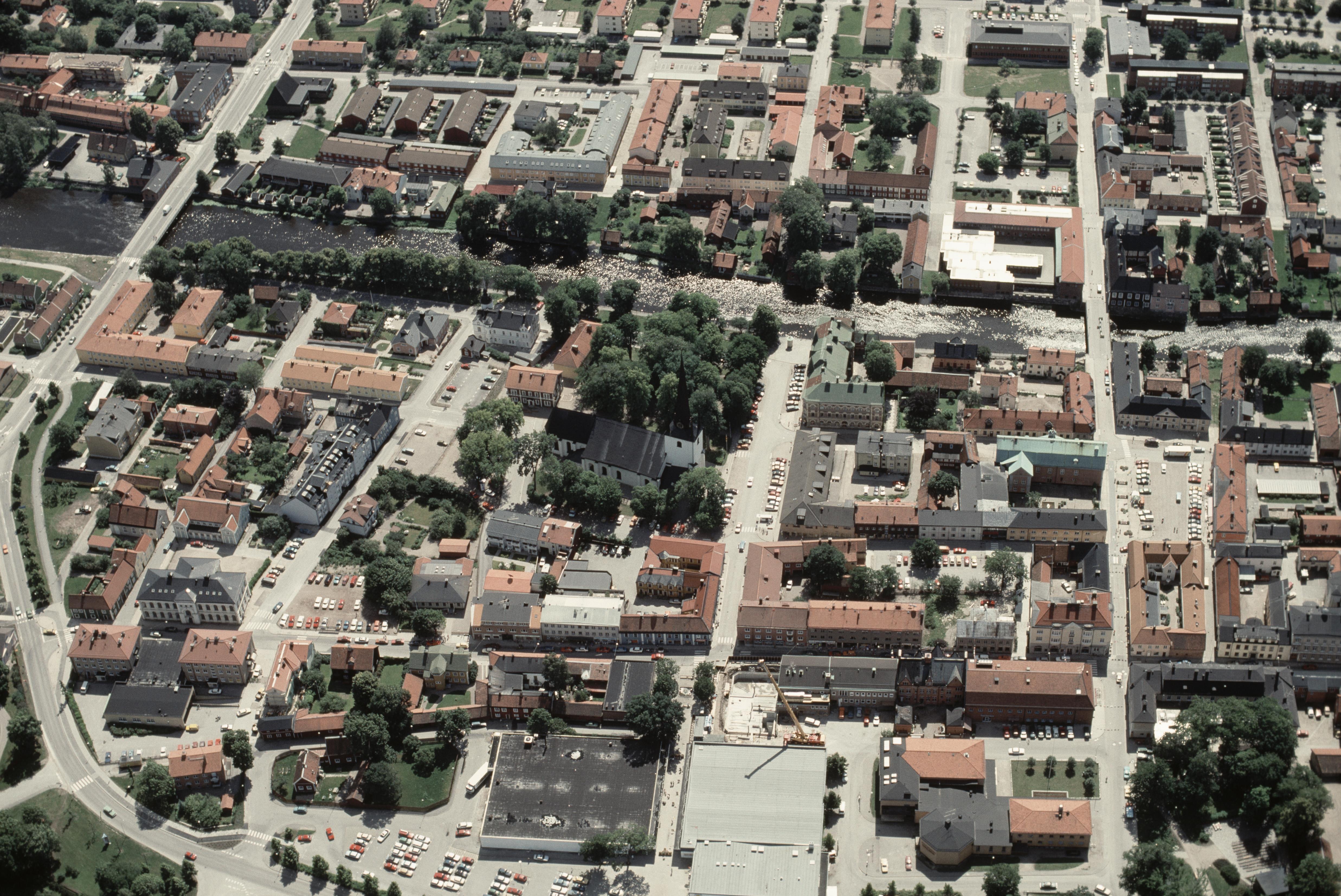 Beskrivning: Arboga stad vid Arbogaån. Heliga Trefaldighetskyrka i stadslager RAÄnr Arboga stad 34:1 i bildens mitt. Bilden är tagen mot (väderstreck): SSO