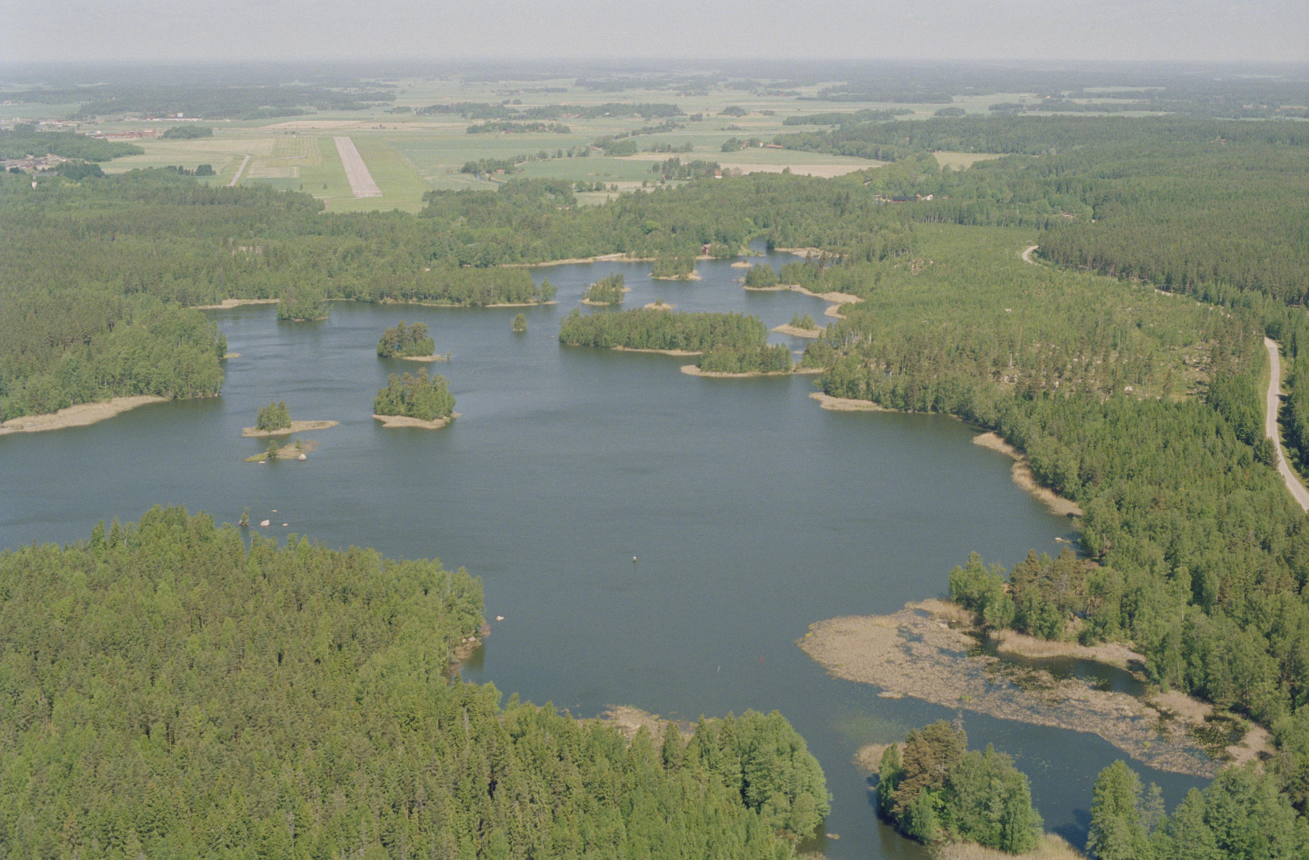 Beskrivning: Hjälmare kanal vid Kvarnsjön. Nere till höger torpet Skogstorp. Vid bildens mitt stensättning RAÄnr Säterbo 23:1 i vattnet. Uppe i bildens vänstra kant området Hällby kvarn och Arboga flygfält vid Säterbo. Bilden är tagen mot (väderstreck): NNV