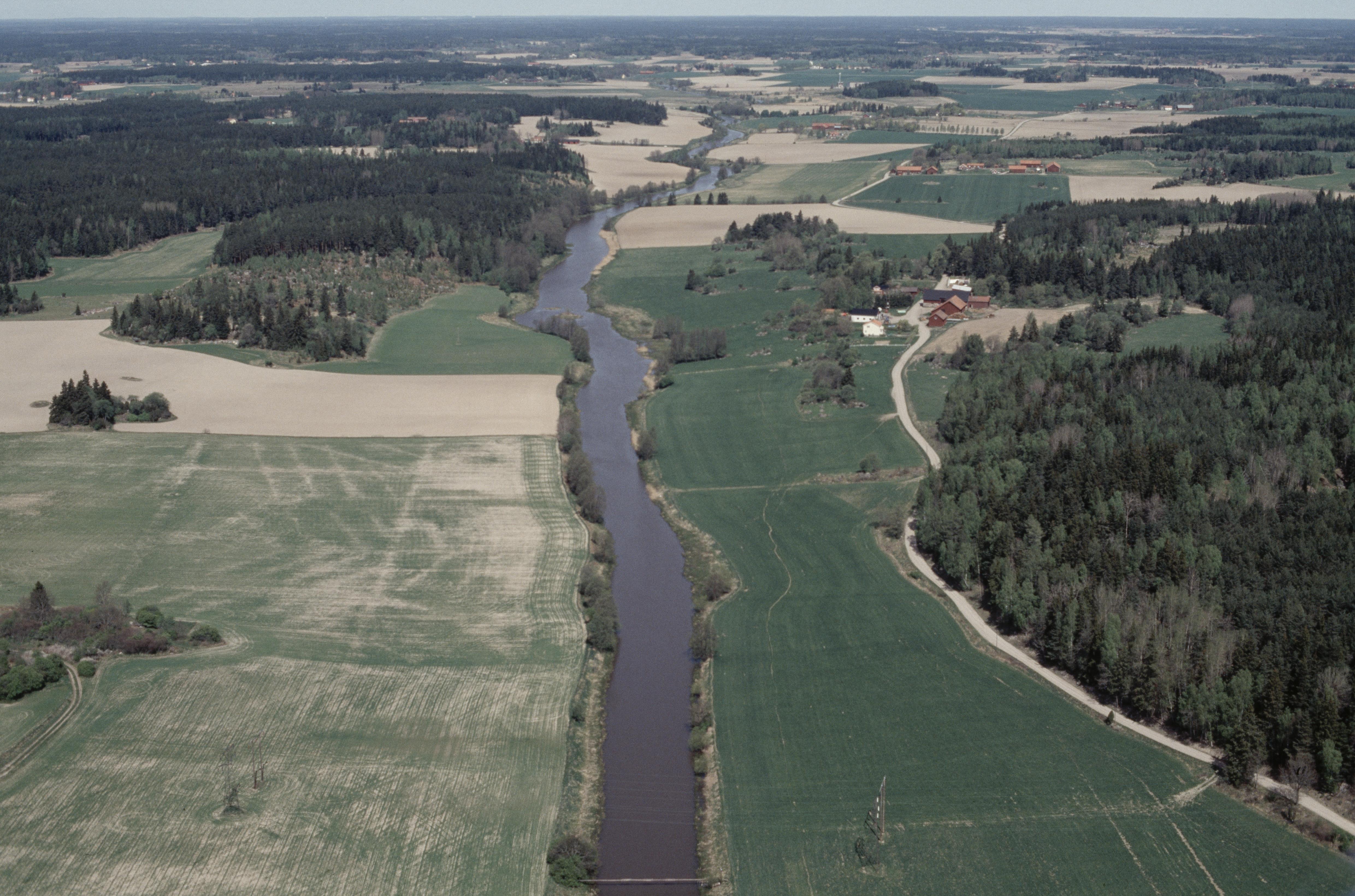 Beskrivning: Sagåns dalgång norr om Nykvarn och Östanbro. Ån markerar gränsen mellan Björksta socken i landskapet Västmanland i riksintresset U28 (till vänster) och socknen Bred och Tillinge i landskapet Uppland i riksintresset C55 (till höger). Till vänster om bildens mitt Näsborgen RAÄnr Björksta 31:1 vid byn Näs. Bilden är tagen mot (väderstreck): NNV