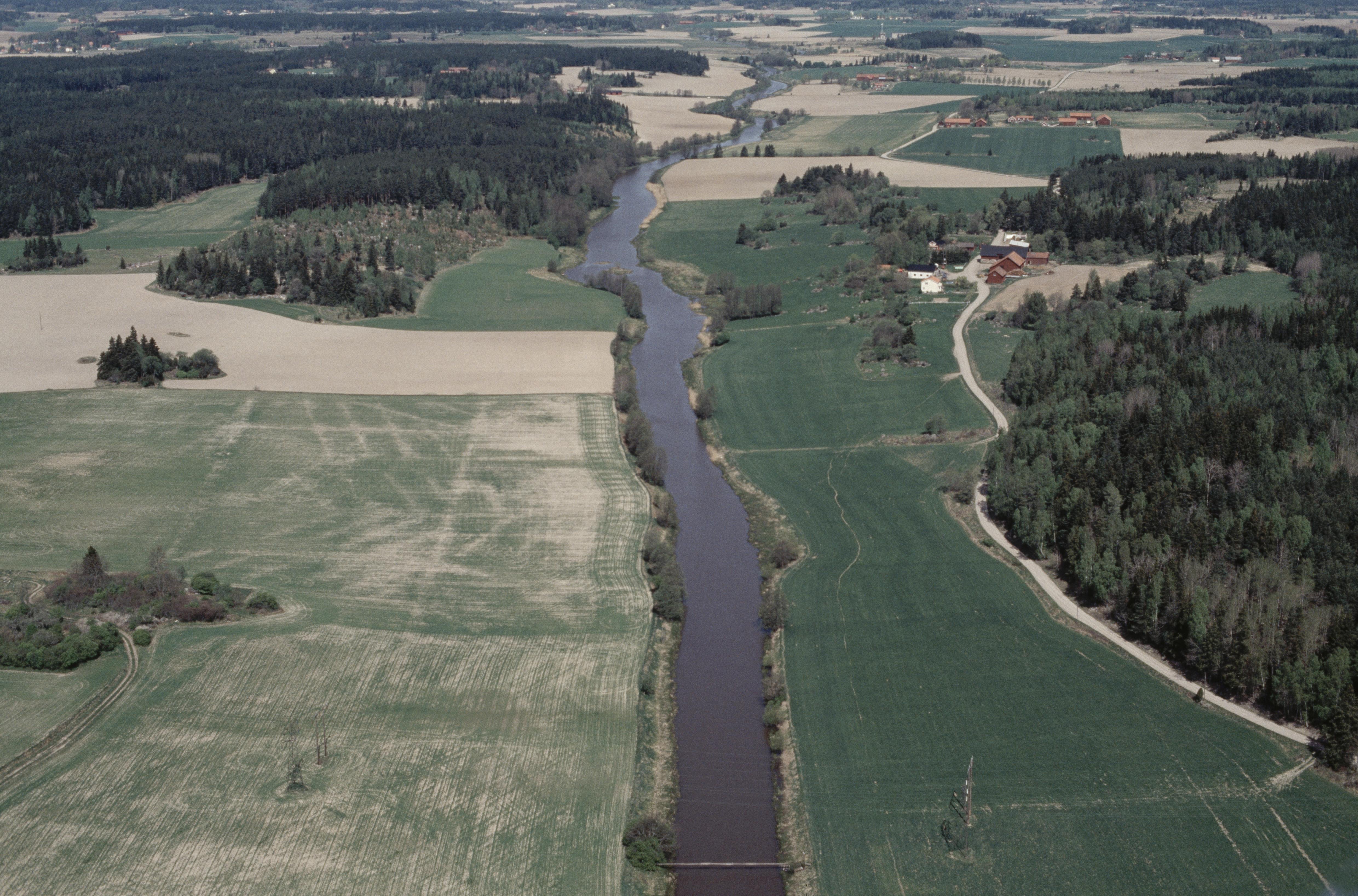 Beskrivning: Sagåns dalgång norr om Nykvarn och Östanbro. Ån markerar gränsen mellan Björksta socken i landskapet Västmanland i riksintresset U28 (till vänster) och socknen Bred och Tillinge i landskapet Uppland i riksintresset C55 (till höger). Till vänster om bildens mitt Näsborgen RAÄnr Björksta 31:1 vid byn Näs. Bilden är tagen mot (väderstreck): NNV