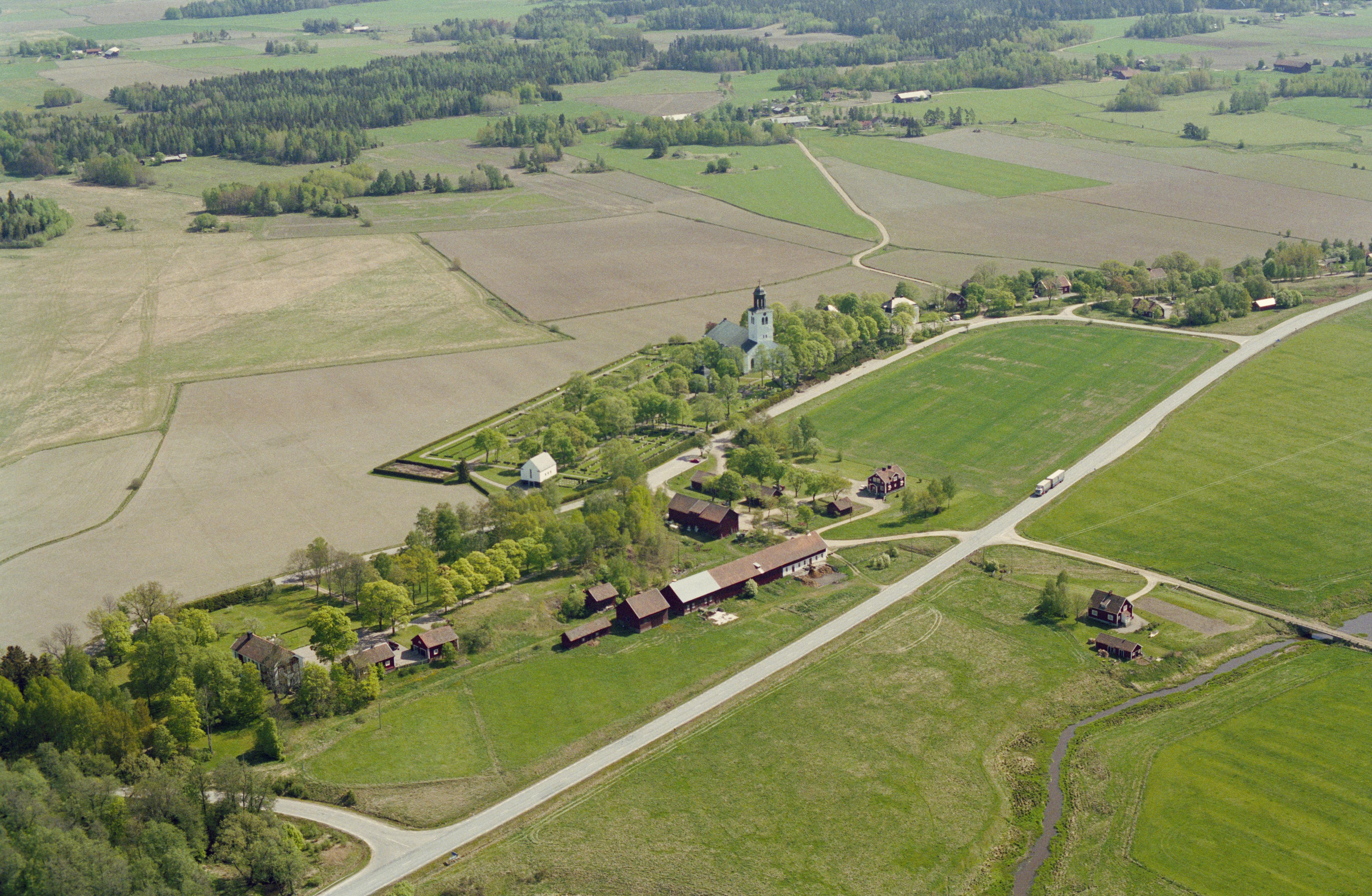Beskrivning: Vid bildens mitt Fellingsbro kyrka och kyrkby i Ässingåns dalgång. På sydost sidan av kyrkan kastalruinen RAÄnr Fellingsbro 231:1. Bilden är tagen mot (väderstreck): Ö
