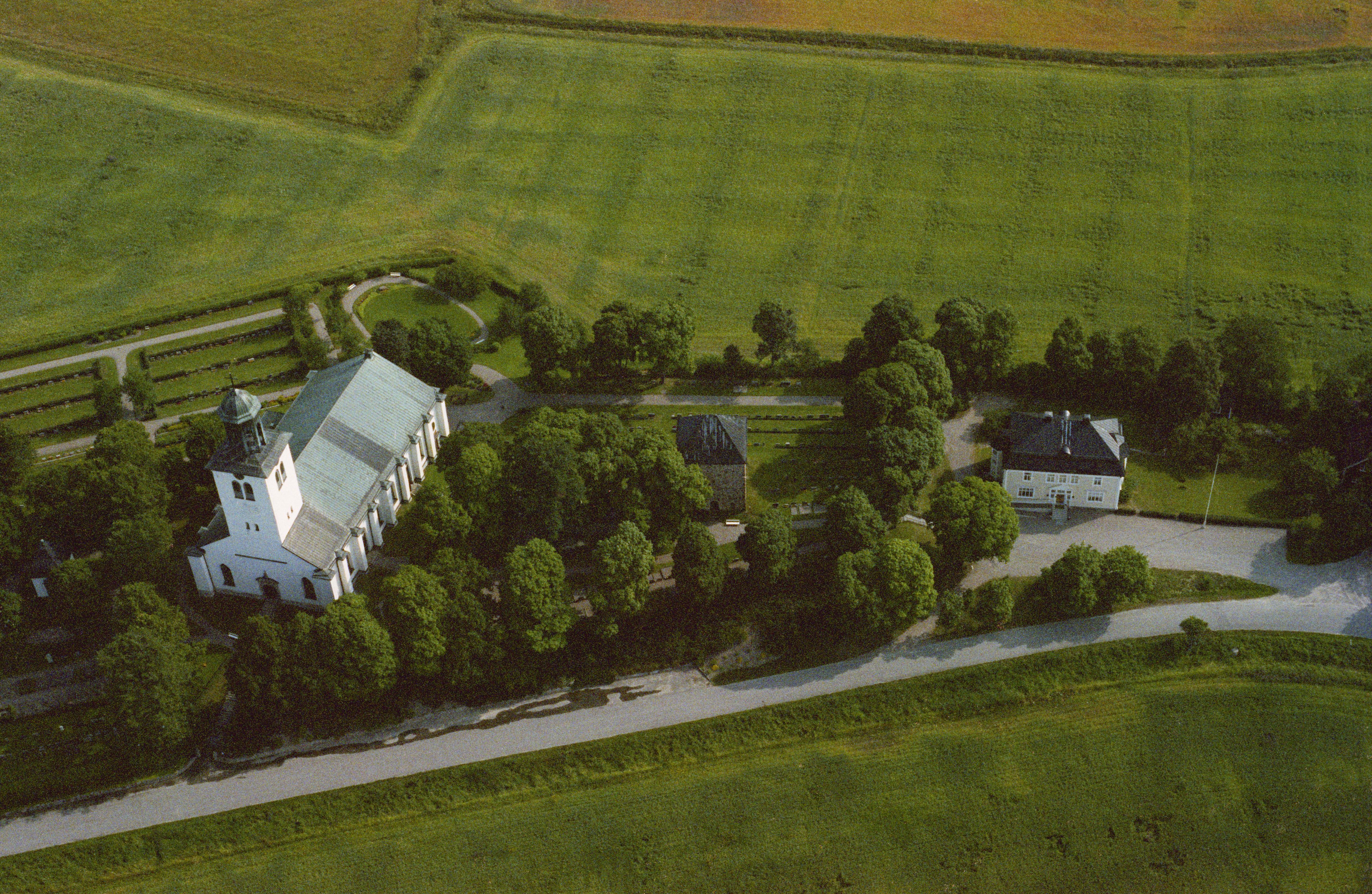 Beskrivning: Fellingsbro kyrka och kyrkby i Ässingåns dalgång. Till höger om kyrkan kastalruinen RAÄnr Fellingsbro 231:1. Bilden är tagen mot (väderstreck): NO