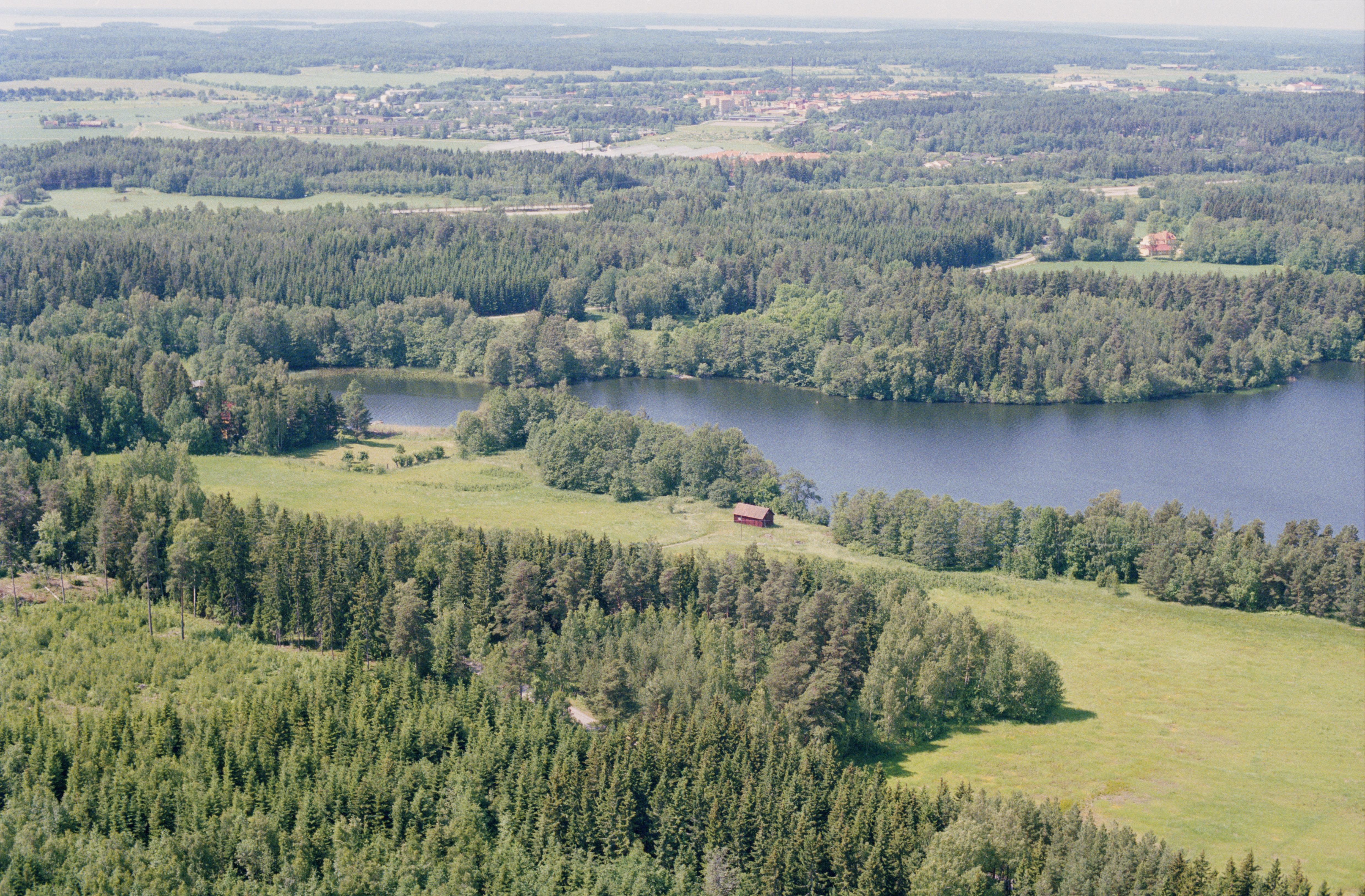 Beskrivning: I bildens nedre del torpet Stora Tingsviken vid Lejondalssjön vid Stora Tingsviken. Under bildens mitt stensättning RAÄnr Bro 129:1. Bilden är tagen mot (väderstreck): VSV
