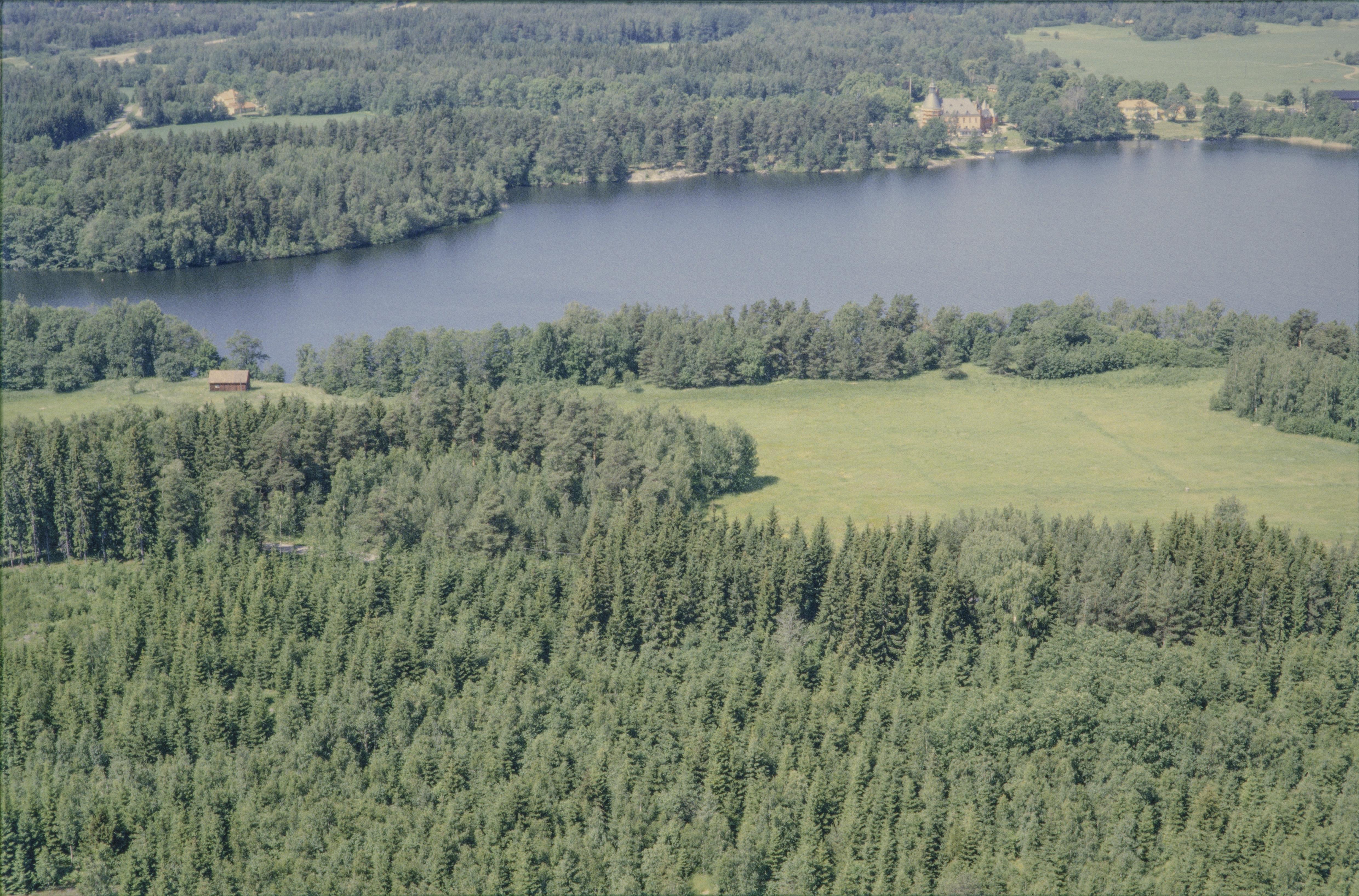 Beskrivning: Till vänster om bildens mitt torpet Stora Tingsviken vid södra änden av Lejondalssjön. Vid bildens mitt stensättning RAÄnr Bro 129:1. Lejondals slott uppe till höger. Bilden är tagen mot (väderstreck): V