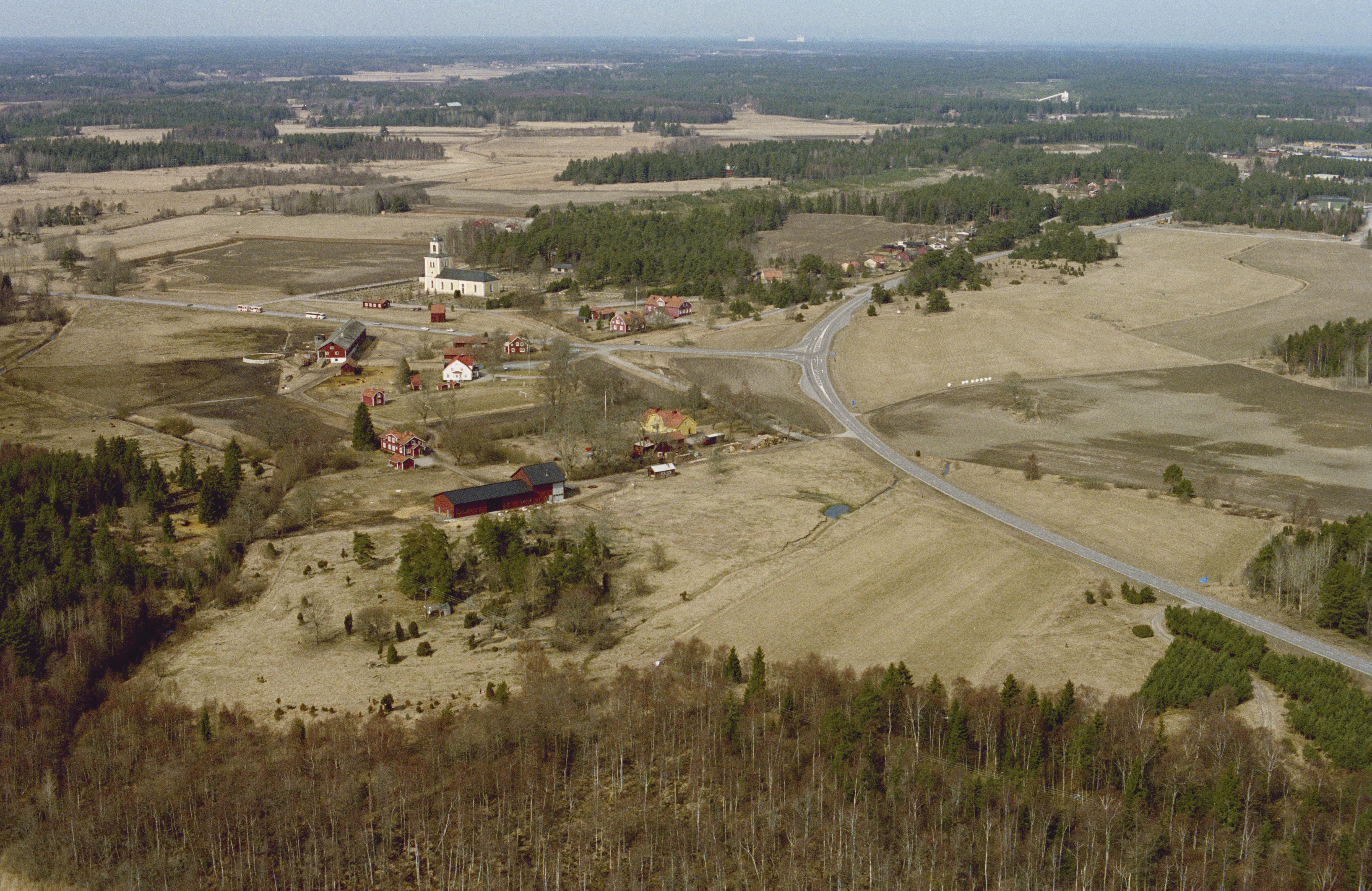 Beskrivning: I bildens nedre del bytomt RAÄnr Börstil 268:1-2 m.fl. Till vänster över bildens mitt Börstils kyrka vid ån Norsdiket. Bilden är tagen mot (väderstreck): NV