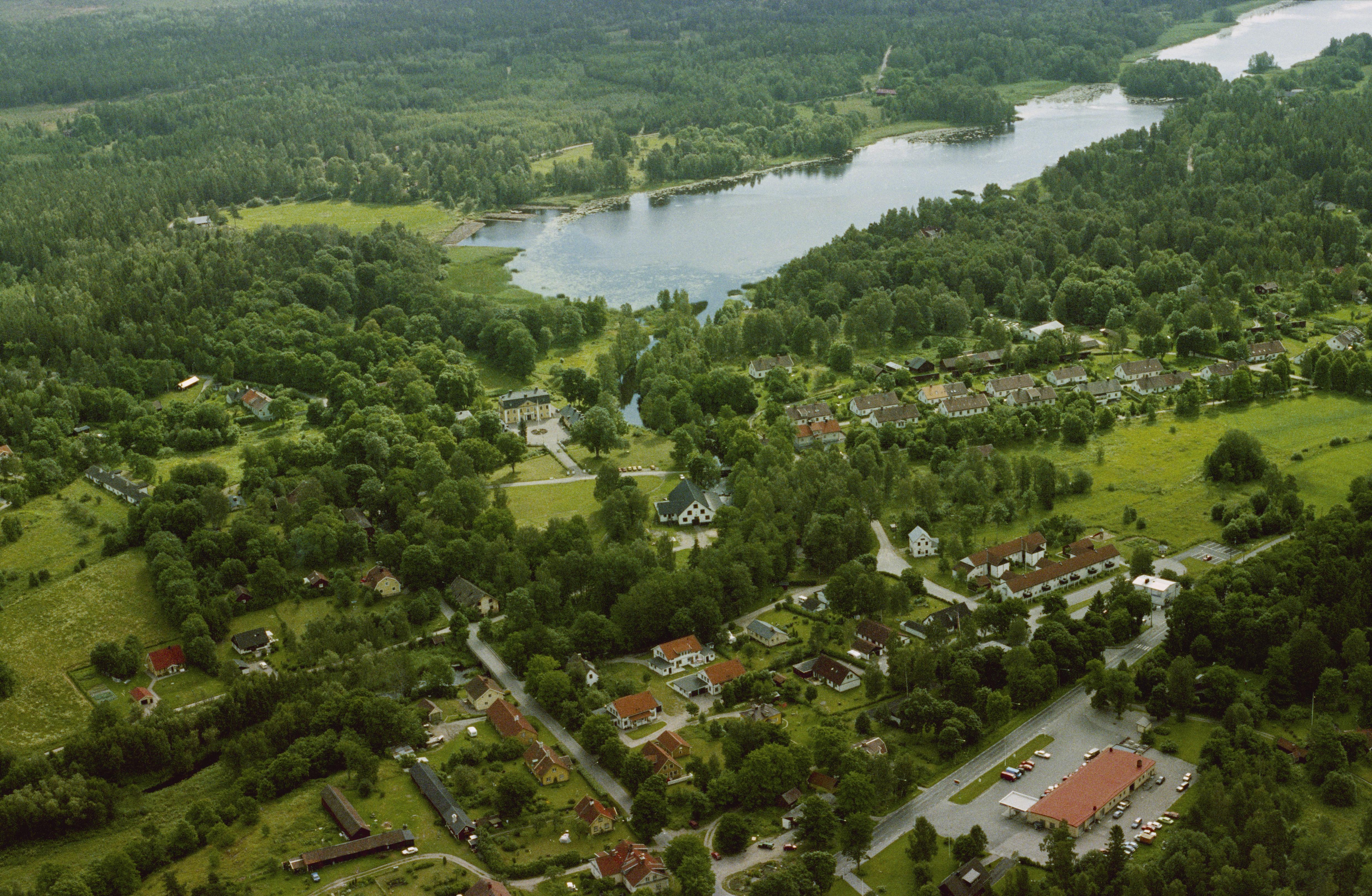 Beskrivning: Skebobruk RAÄnr Ununge 127:1 vid Skeboån och sjön Närdingen. Till vänster om bildens mitt Skebobruks herrgård. Bilden är tagen mot (väderstreck): SO