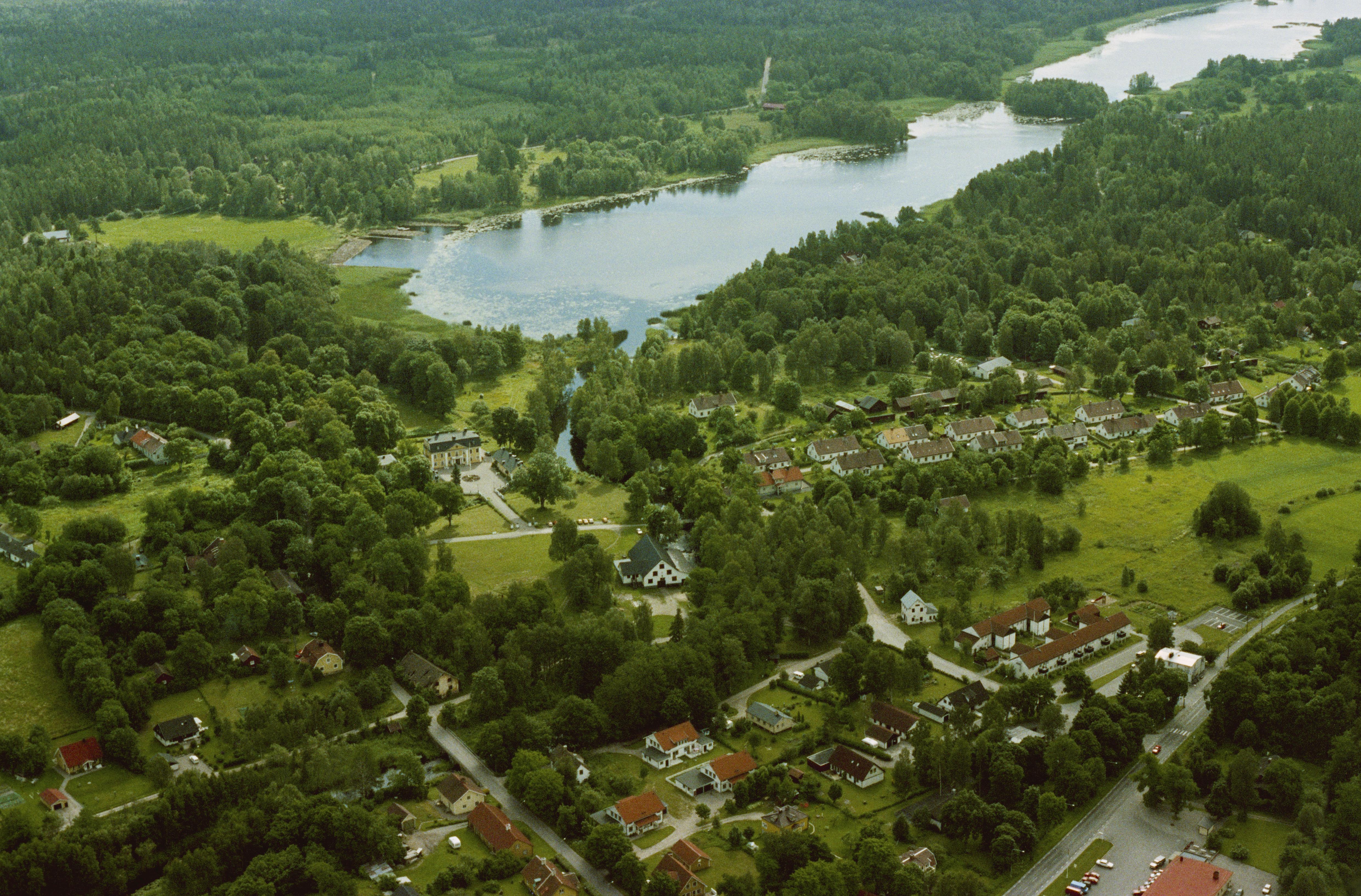 Beskrivning: Skebobruk RAÄnr Ununge 127:1 vid Skeboån och sjön Närdingen. Till vänster om bildens mitt Skebobruks herrgård. Bilden är tagen mot (väderstreck): SO