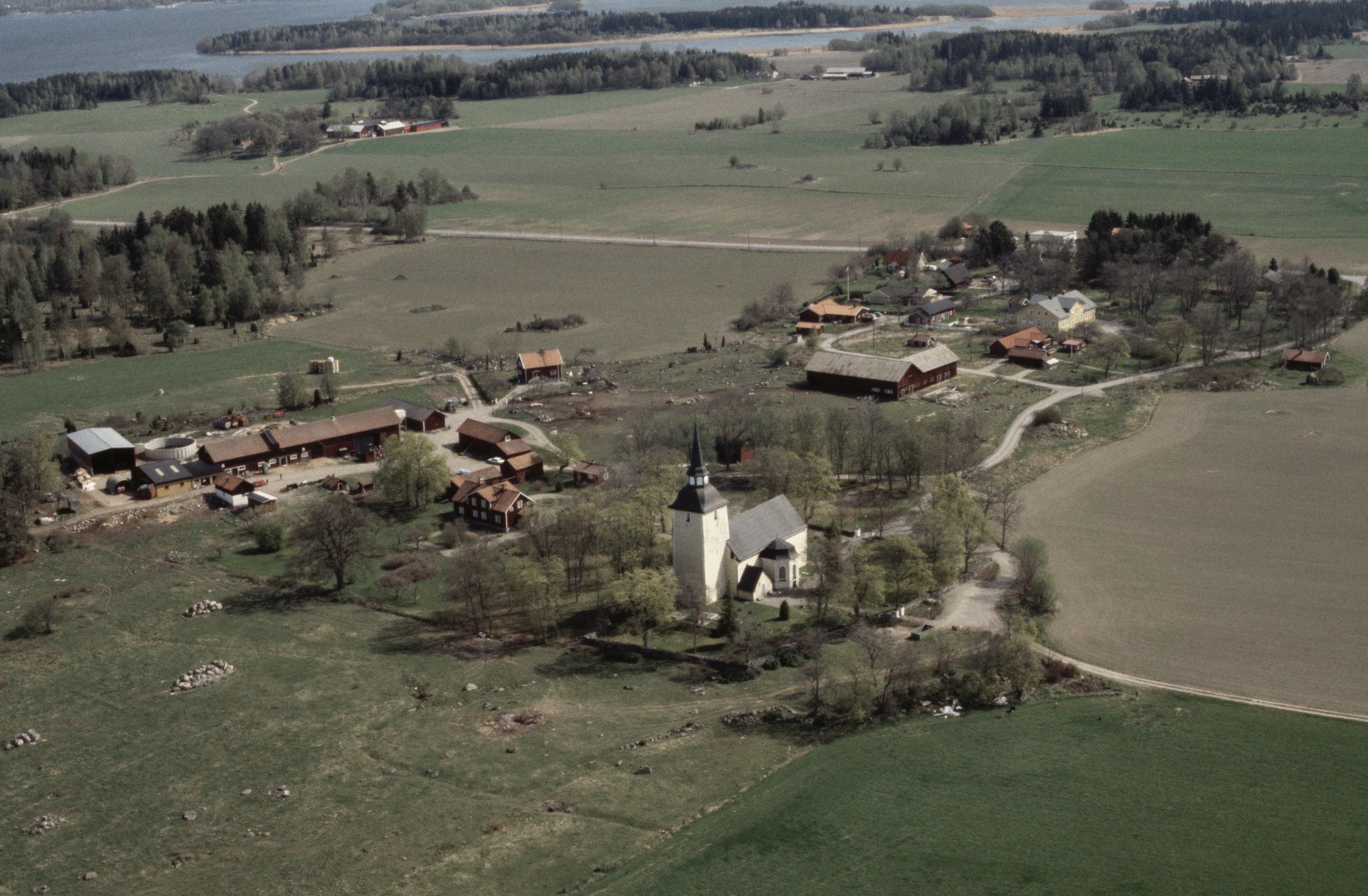 Beskrivning: Enköpings-Näs kyrka och kyrkby. I bildens övre del Svinnegarnsviken i Mälaren. Bilden är tagen mot (väderstreck): NO