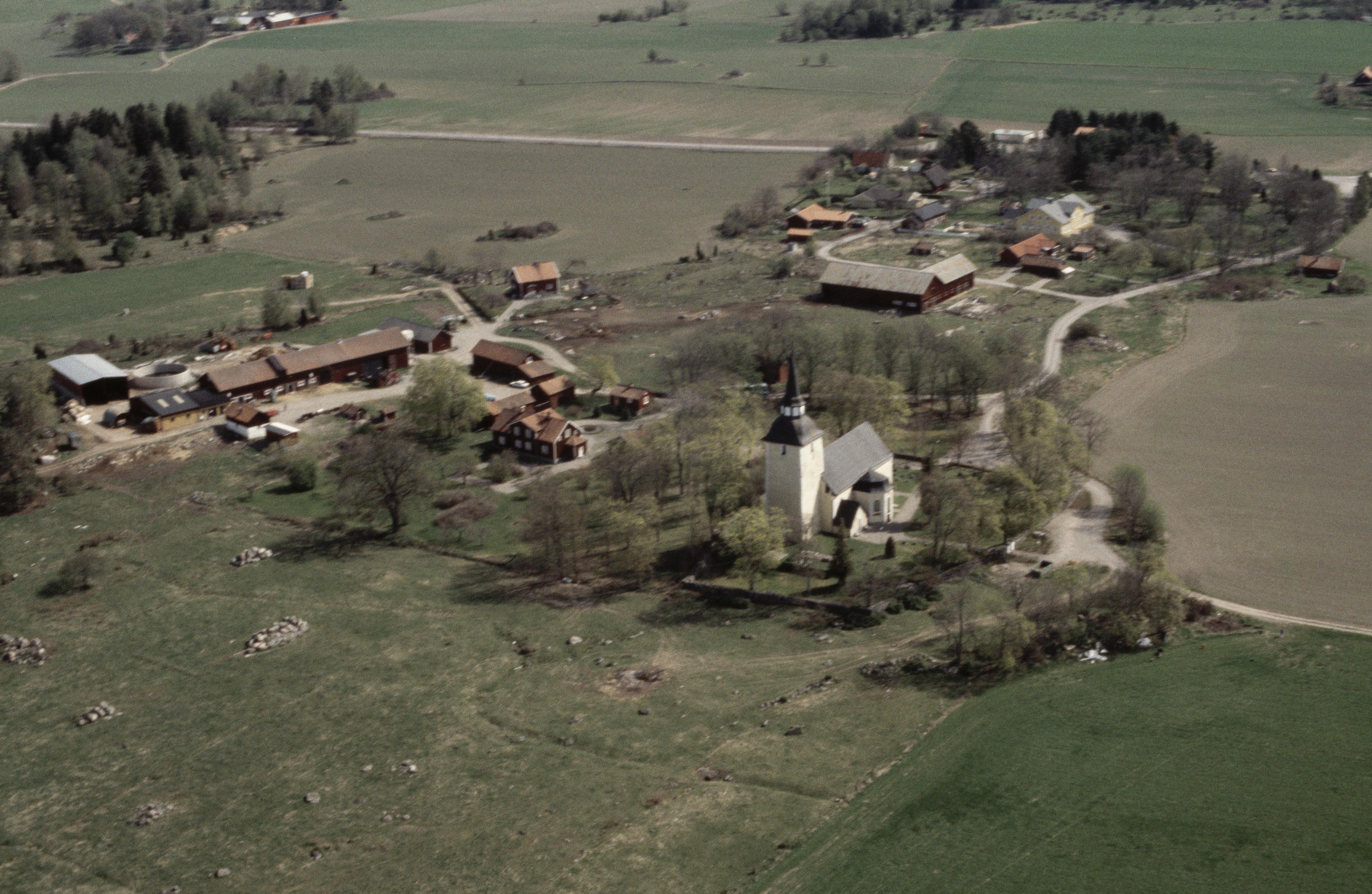 Beskrivning: Enköpings-Näs kyrka och kyrkby. I bildens övre del Svinnegarnsviken i Mälaren. Bilden är tagen mot (väderstreck): NO