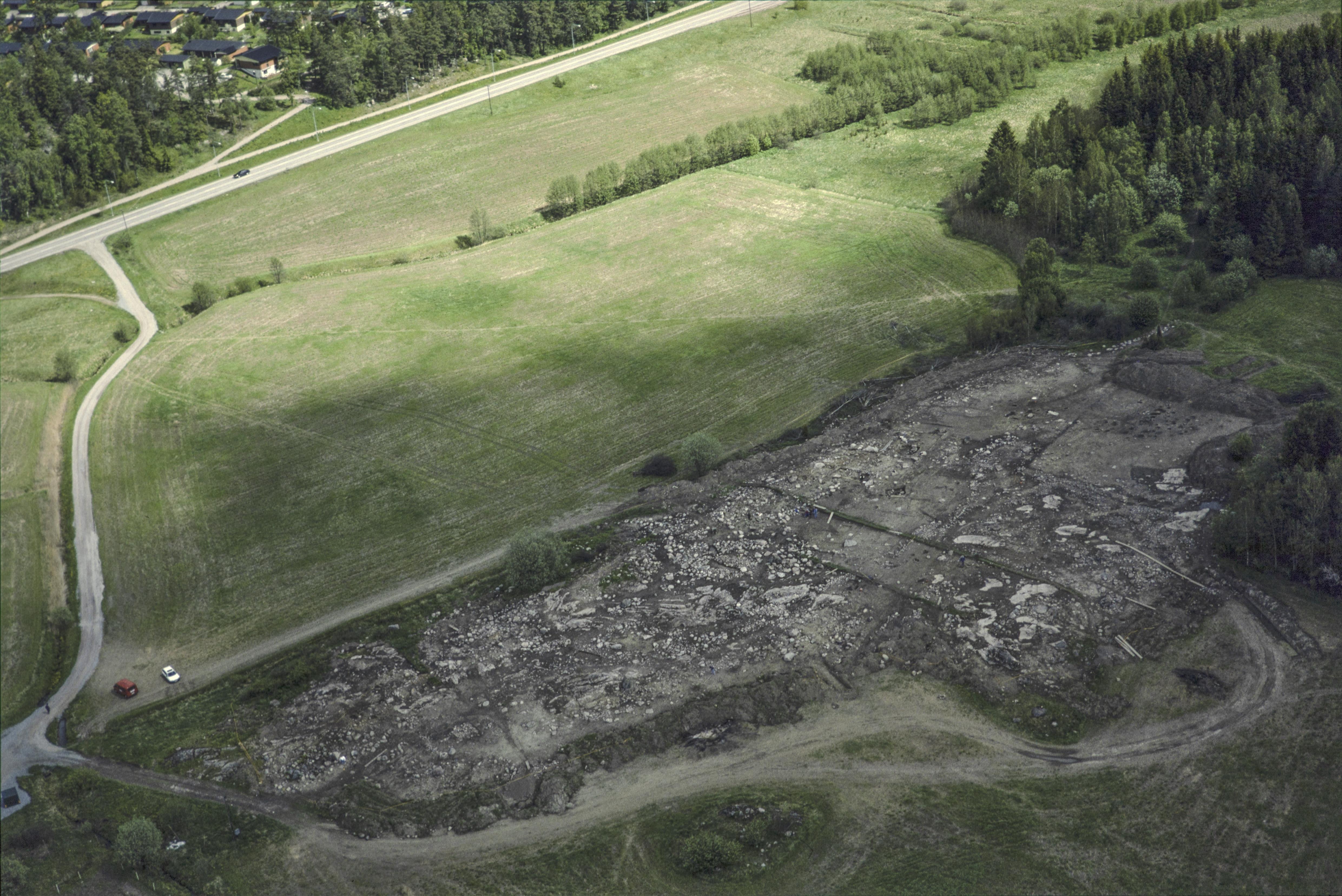 Beskrivning: Arkeologisk undersökning innan bygging av bostäder. Gravfält och boplatsområde RAÄnr Fresta 147:1. Bilden är tagen mot (väderstreck): NO