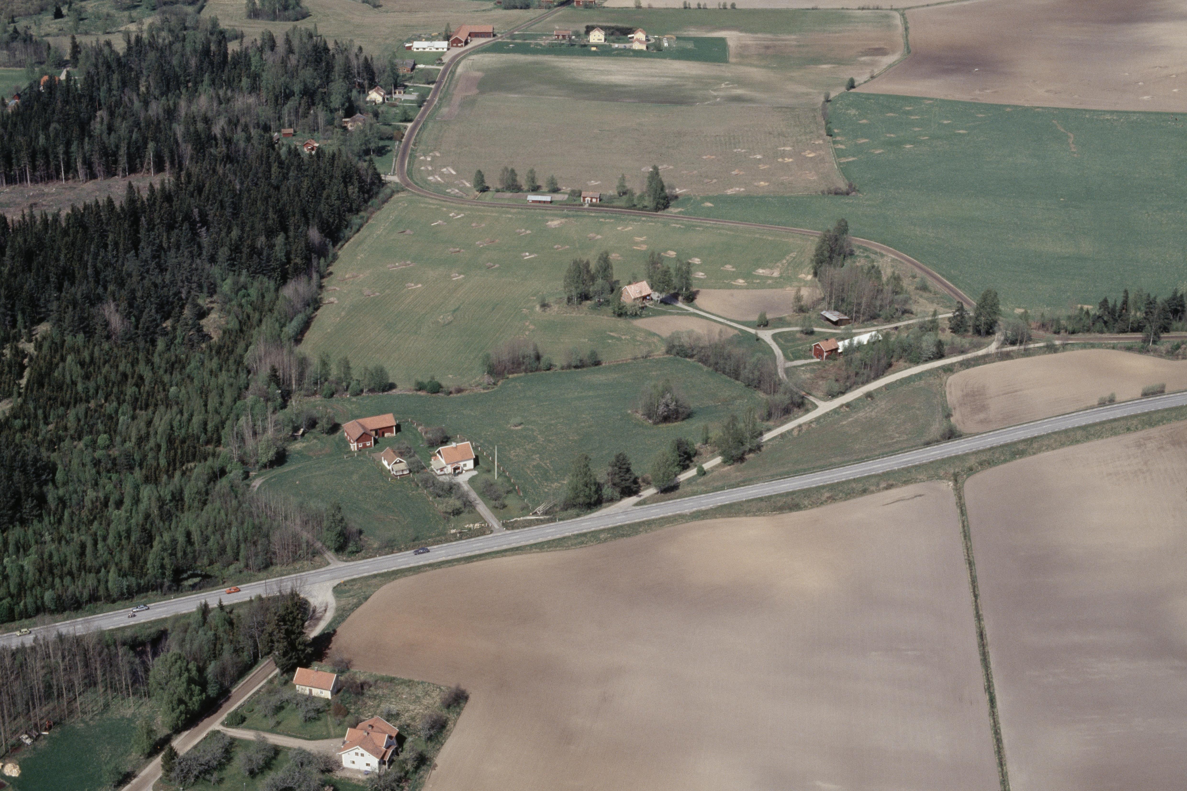 Beskrivning: Beskrivning: Vibyslätten. Arkeologisk undersökning innan vägbygge av E3 / E20 sydväst om Vibysjön. Vid bildens mitt bytomt Viby 227:1 m.fl. I bildens övre del Stubbetorp. Bilden är tagen mot (väderstreck): N Fotosyfte: Flygbildsdokumentation