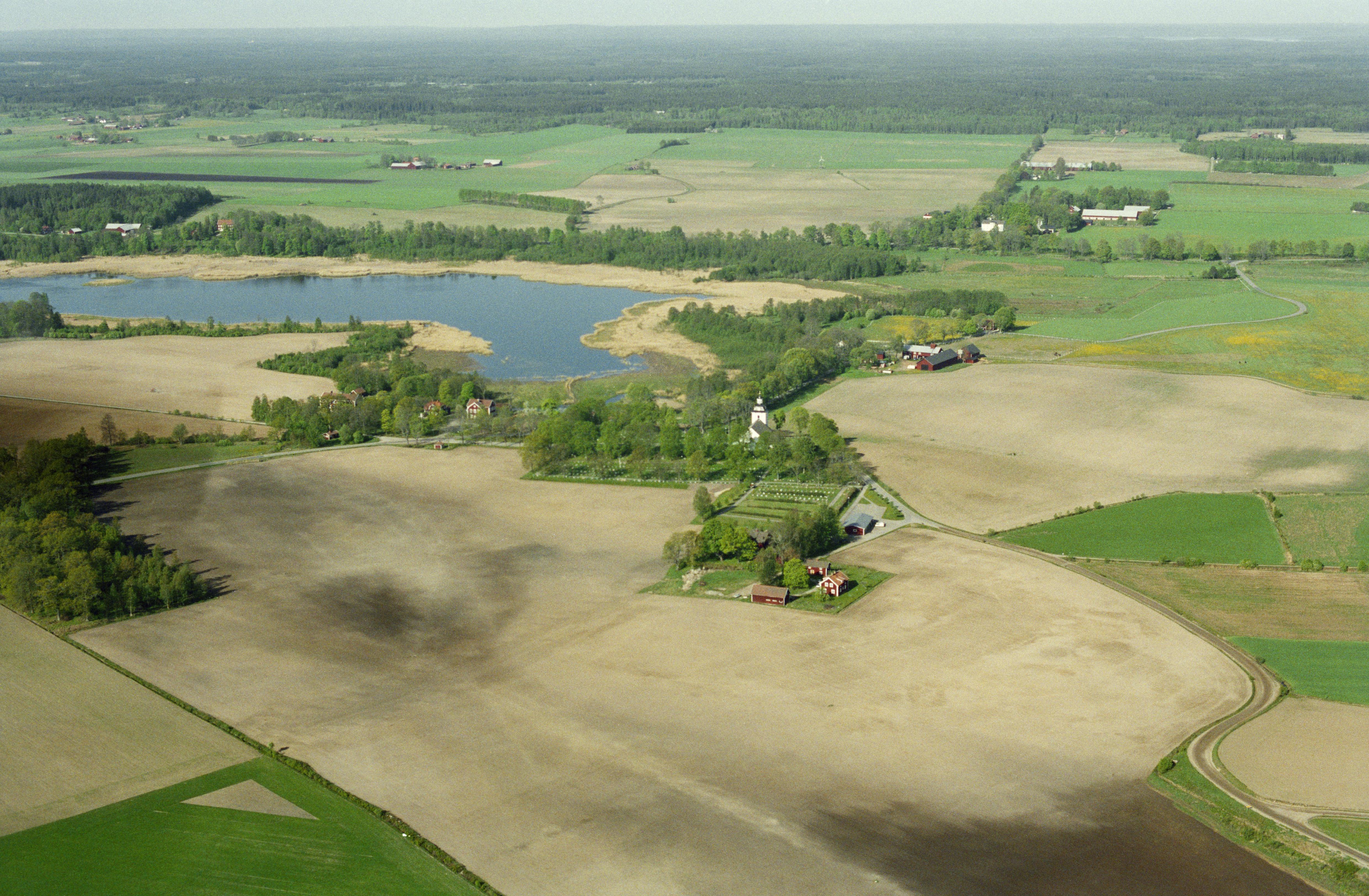 Beskrivning: Viby hembygdsgård, Viby kyrka och Viby gård vid Vibysjön. I bildens övre del Körtingsbergs herrgård. Bilden är tagen mot (väderstreck): SV