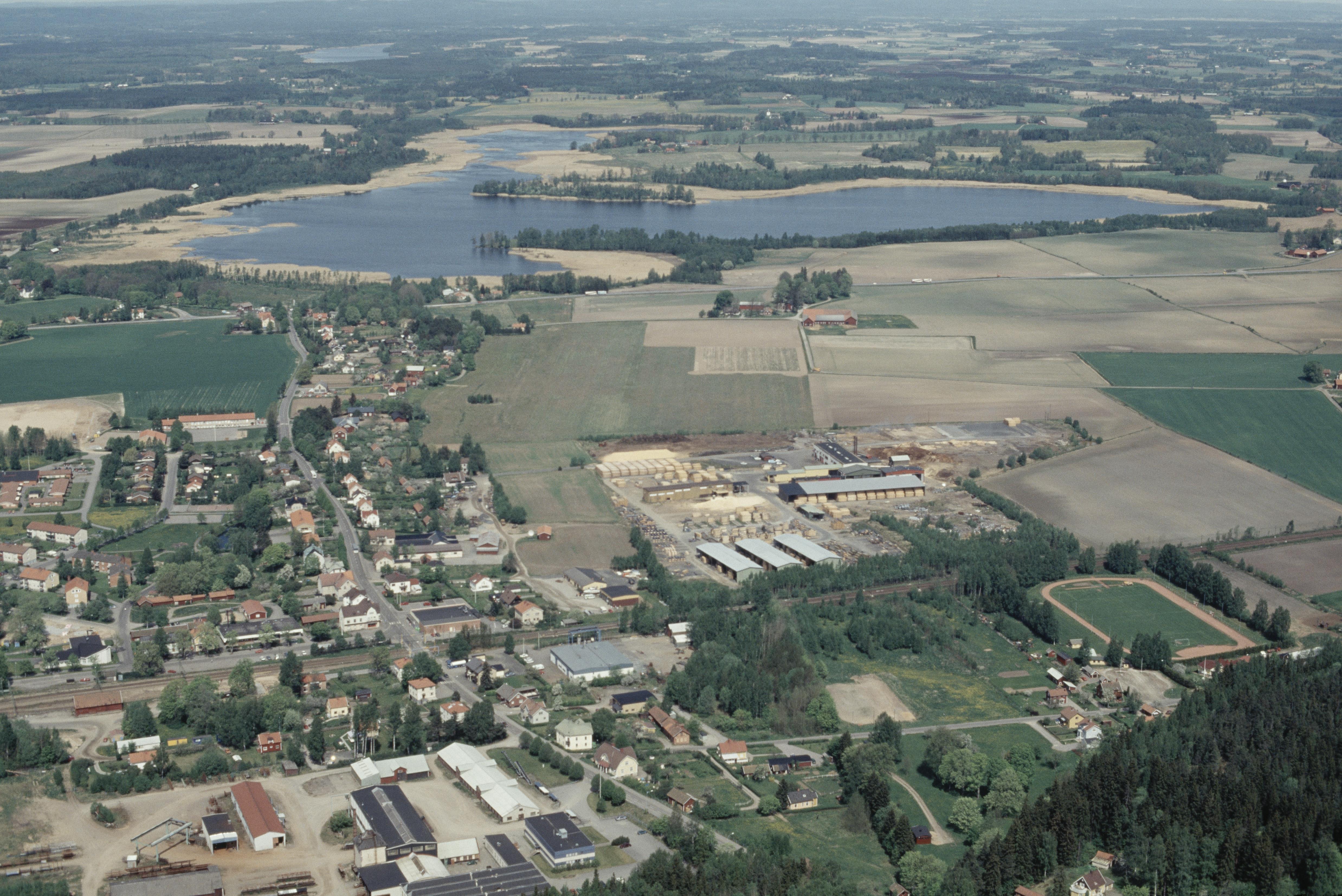 Beskrivning: Vretstorps täort innan vägbygge av E3 / E20. Vid bildens mitt gårdarna Lilla Vretstorp, Stora Vretstorp, Skävi, Vreten m.fl. I bildens övre del Vibysjön och Viby kyrka. Bilden är tagen mot (väderstreck): N
