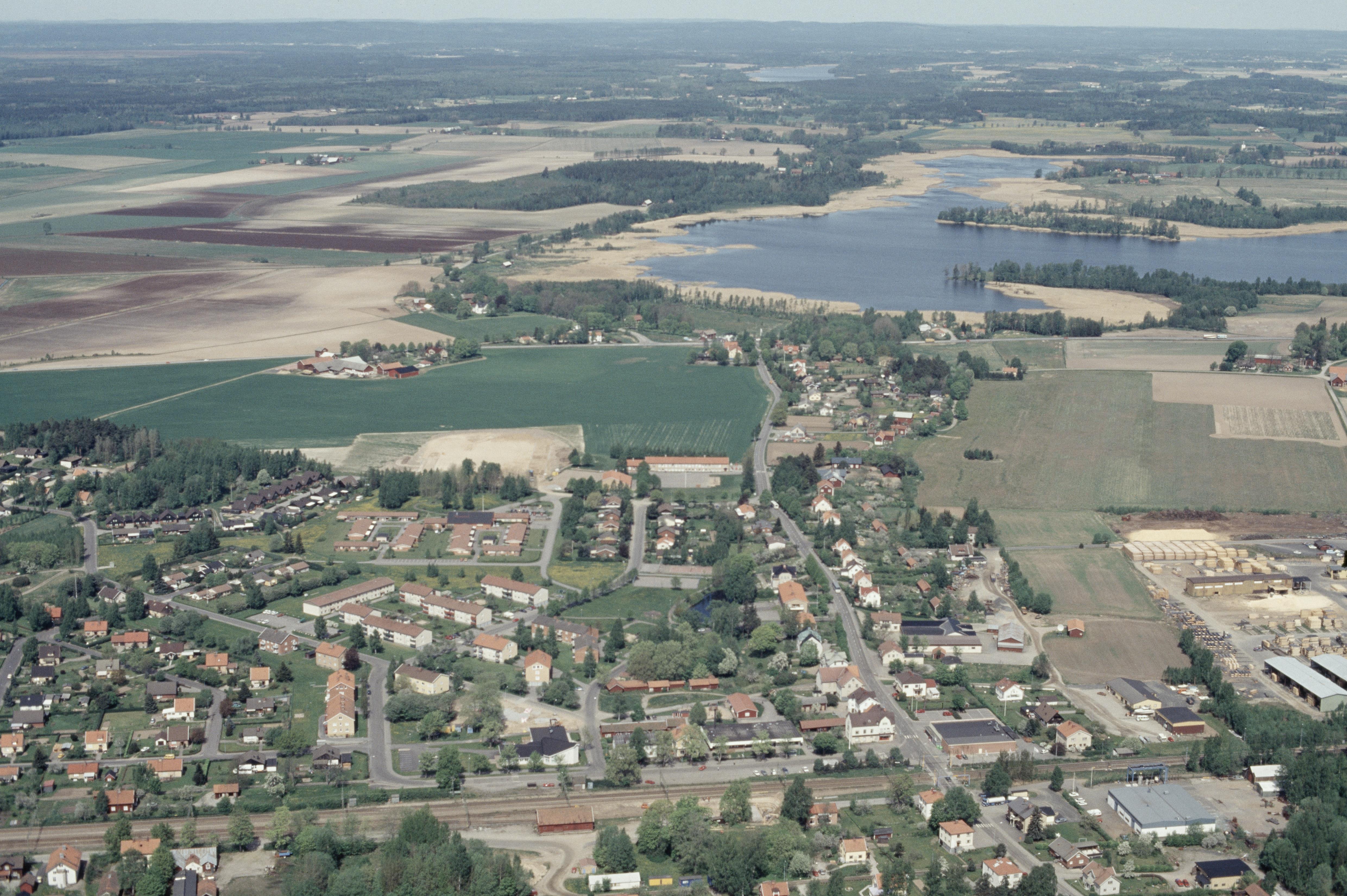 Beskrivning: Vretstorps täort innan vägbygge av E3 / E20. Vid bildens mitt gårdarna Lilla Vretstorp, Stora Vretstorp, Skävi, Vreten m.fl. I bildens övre del Vibysjön och Viby kyrka. Bilden är tagen mot (väderstreck): N
