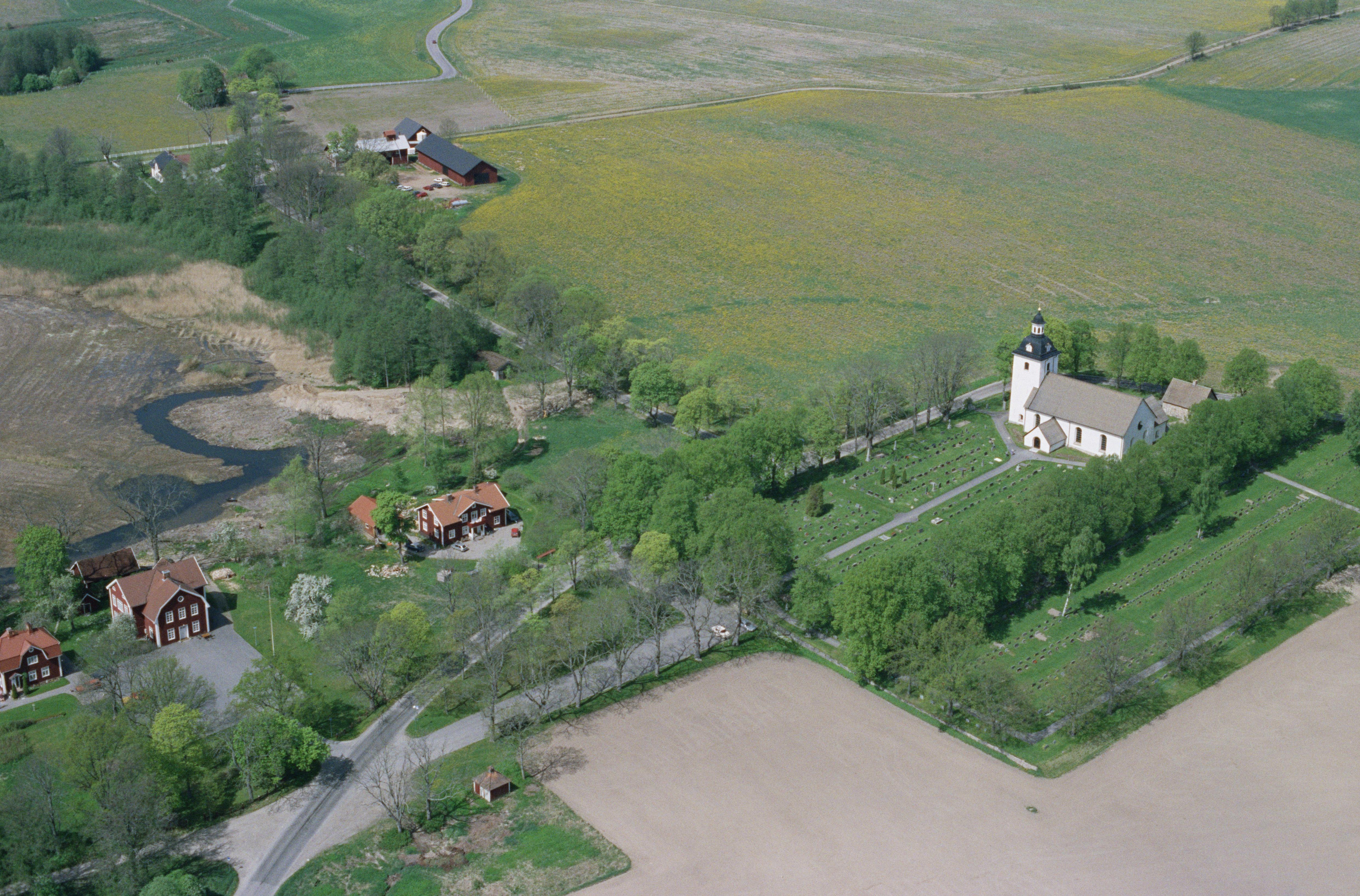 Beskrivning: Viby hembygdsgård, Viby kyrka och uppe till vänster Viby gård vid Vibysjön. Bilden är tagen mot (väderstreck): SV