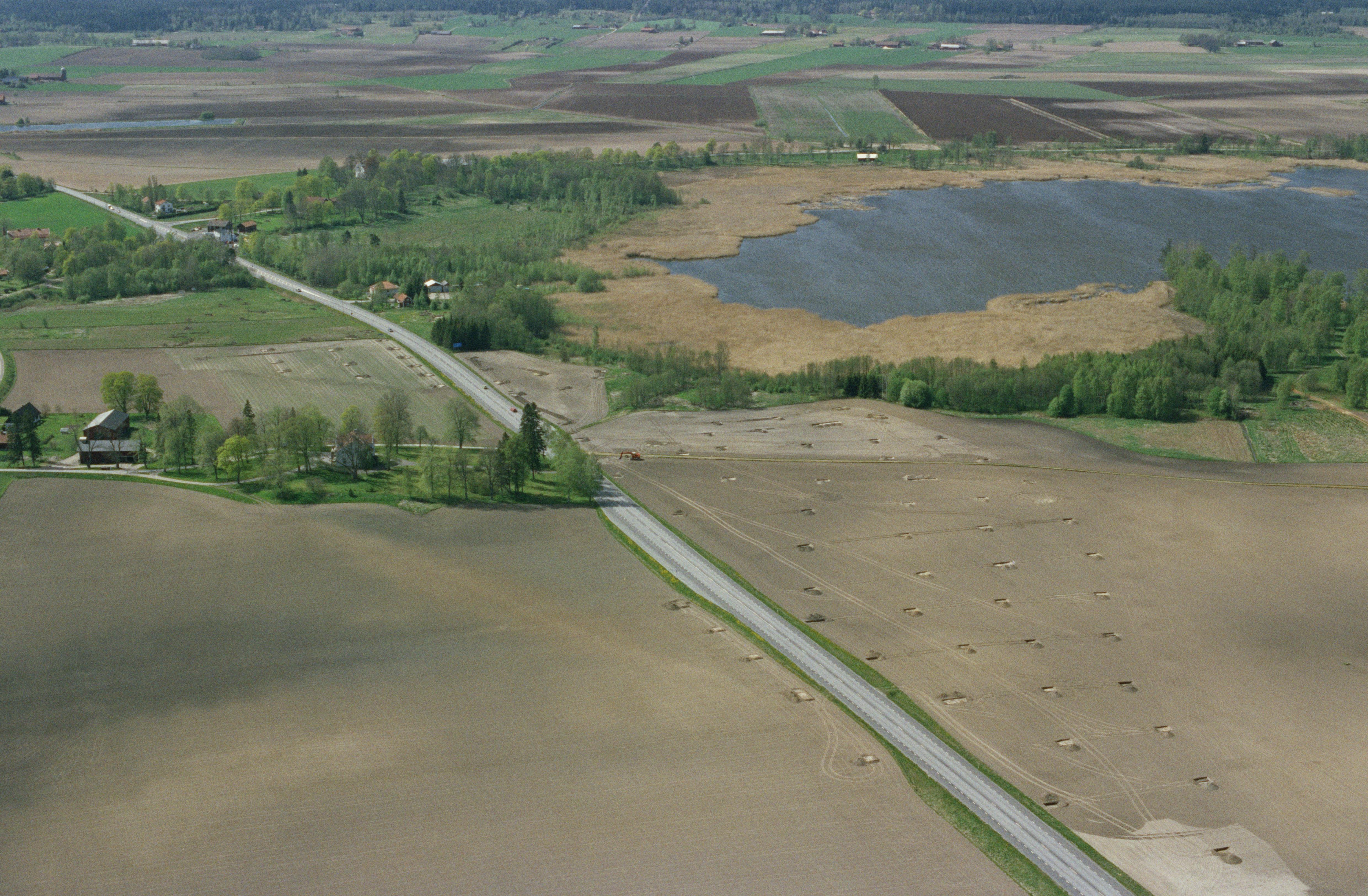 Beskrivning: Arkeologisk undersökning innan vägbygge av E3 / E20 söder om Vibysjön. Bytomt RAÄnr Viby 122:1 och 222:1. Till vänster i bildens övre del gårdarna Stora och Lilla Vretstorp. Bilden är tagen mot (väderstreck): NV