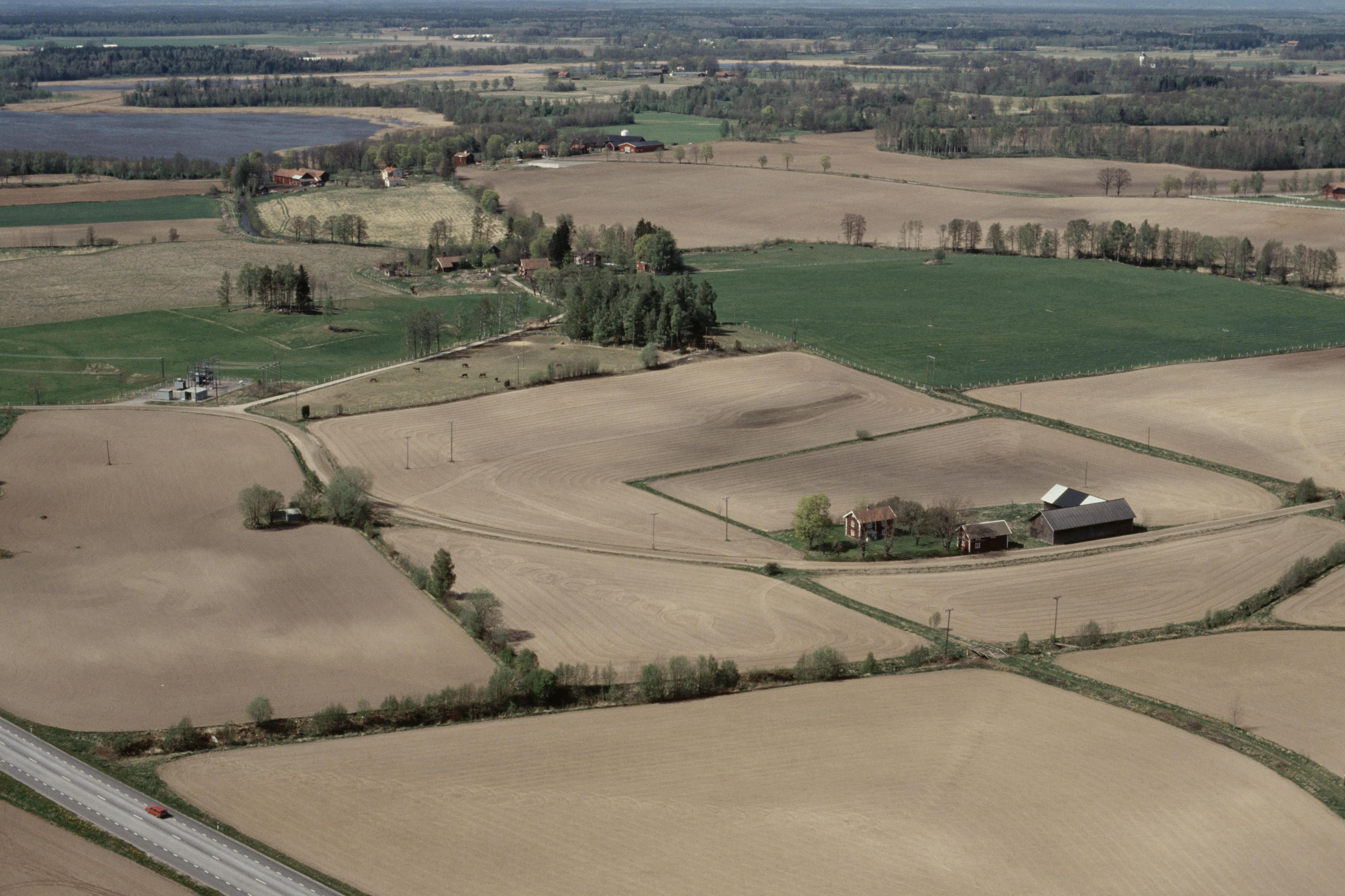 Beskrivning: Ängatorps gård innan vägbygge av E3 / E20. Gårdarna Vreten och Sjörs vid Vibysjön uppe till vänster. Vid bildens mitt bytomt RAÄnr Viby 414. Bilden är tagen mot (väderstreck): V