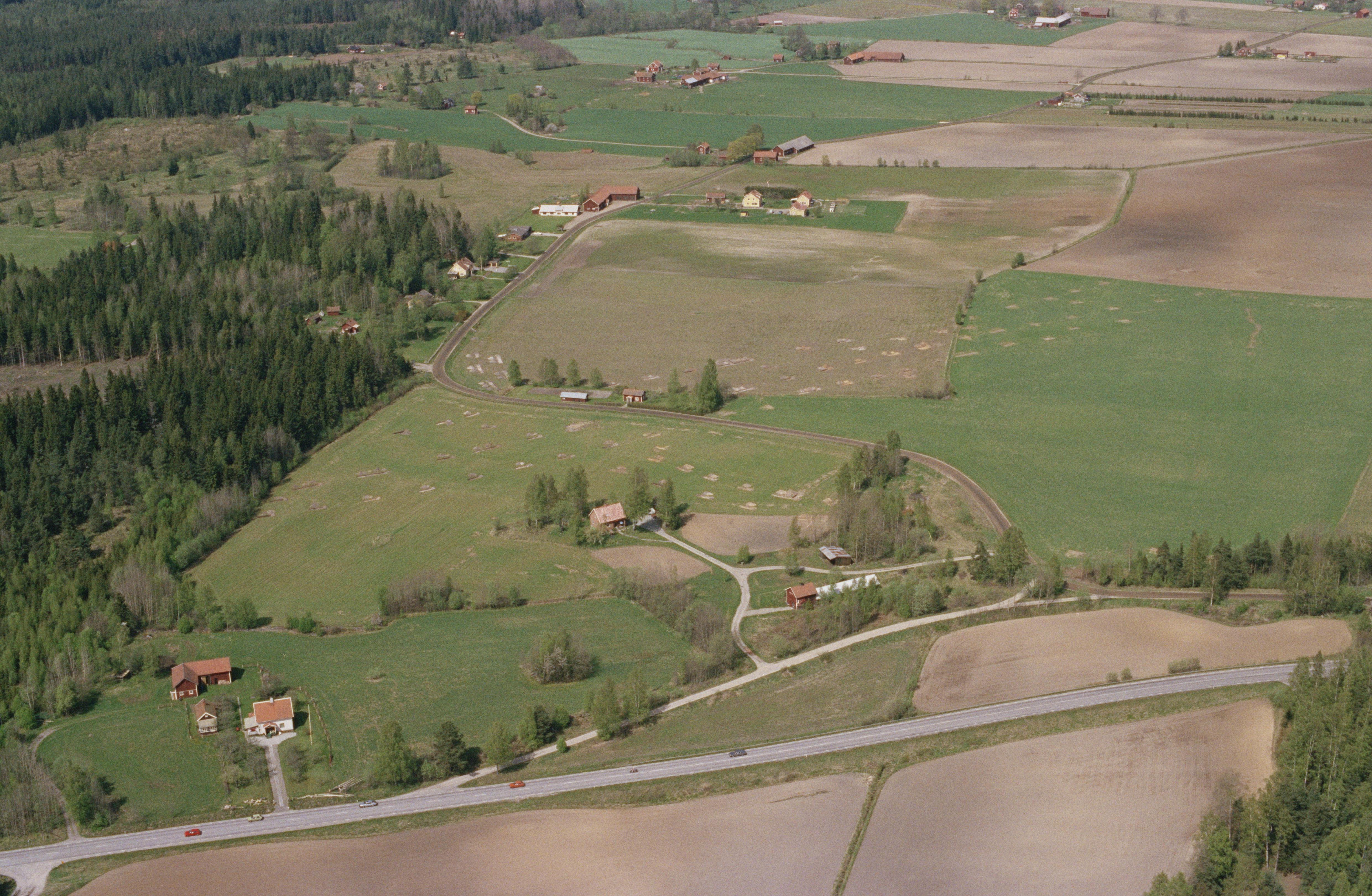 Beskrivning: Vibyslätten. Arkeologisk undersökning innan vägbygge av E3 / E20 sydväst om Vibysjön. Vid bildens mitt bytomt Viby 227:1 m.fl. I bildens övre del Stubbetorp. Bilden är tagen mot (väderstreck): N