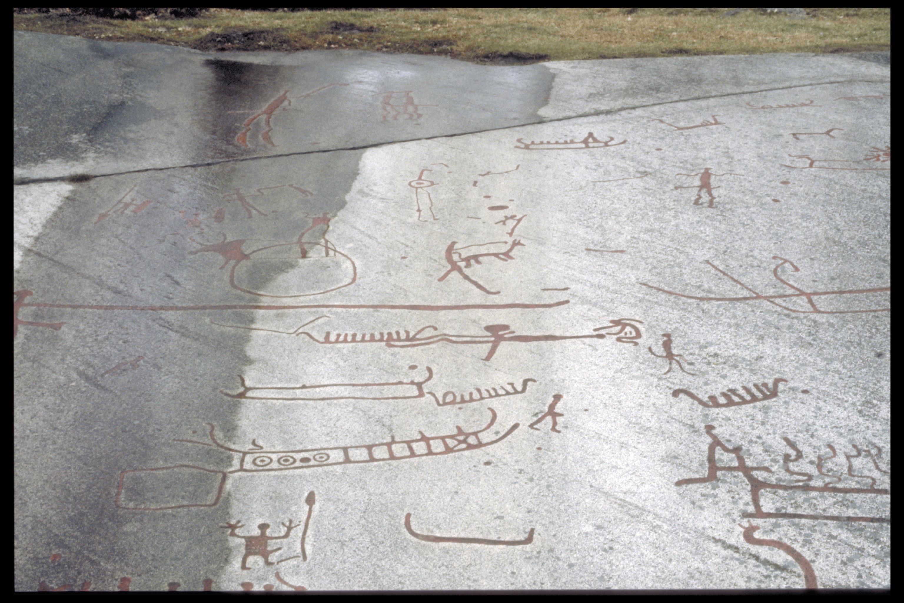 Skepp, krigare med vapen, människo- och djurfigurer. Delvis vattenöversilad. Vitlyckehällen, Tanum 1:1.