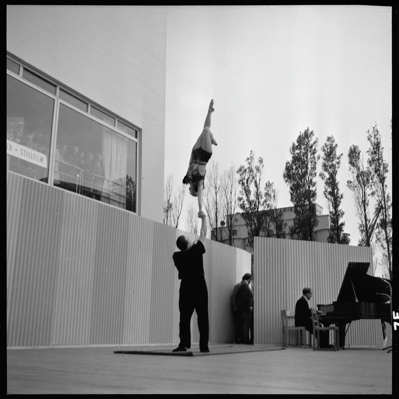 Bilden föreställer en scen framför en fasad. På scenen står en man och håller en kvinna upp och ner på varsin rak arm och liknande poser. I bakgrunden sitter en pianist vid en flygel.