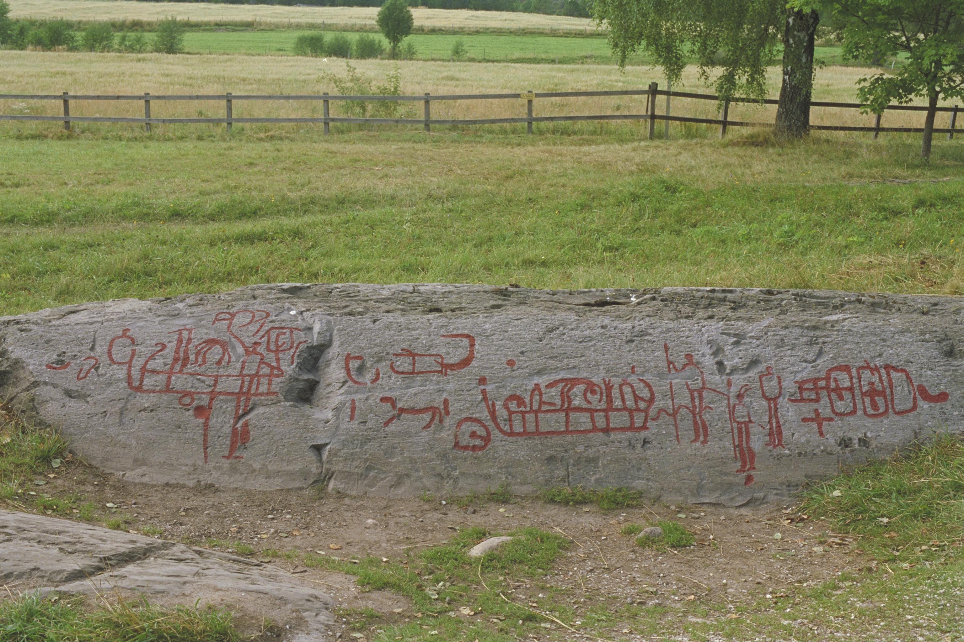 RAÄ-nummer Tisselskog 11:1 Processionshällen. Skepp med voltigörer, människofigurer med spjut, fotsulor och djurfigur.