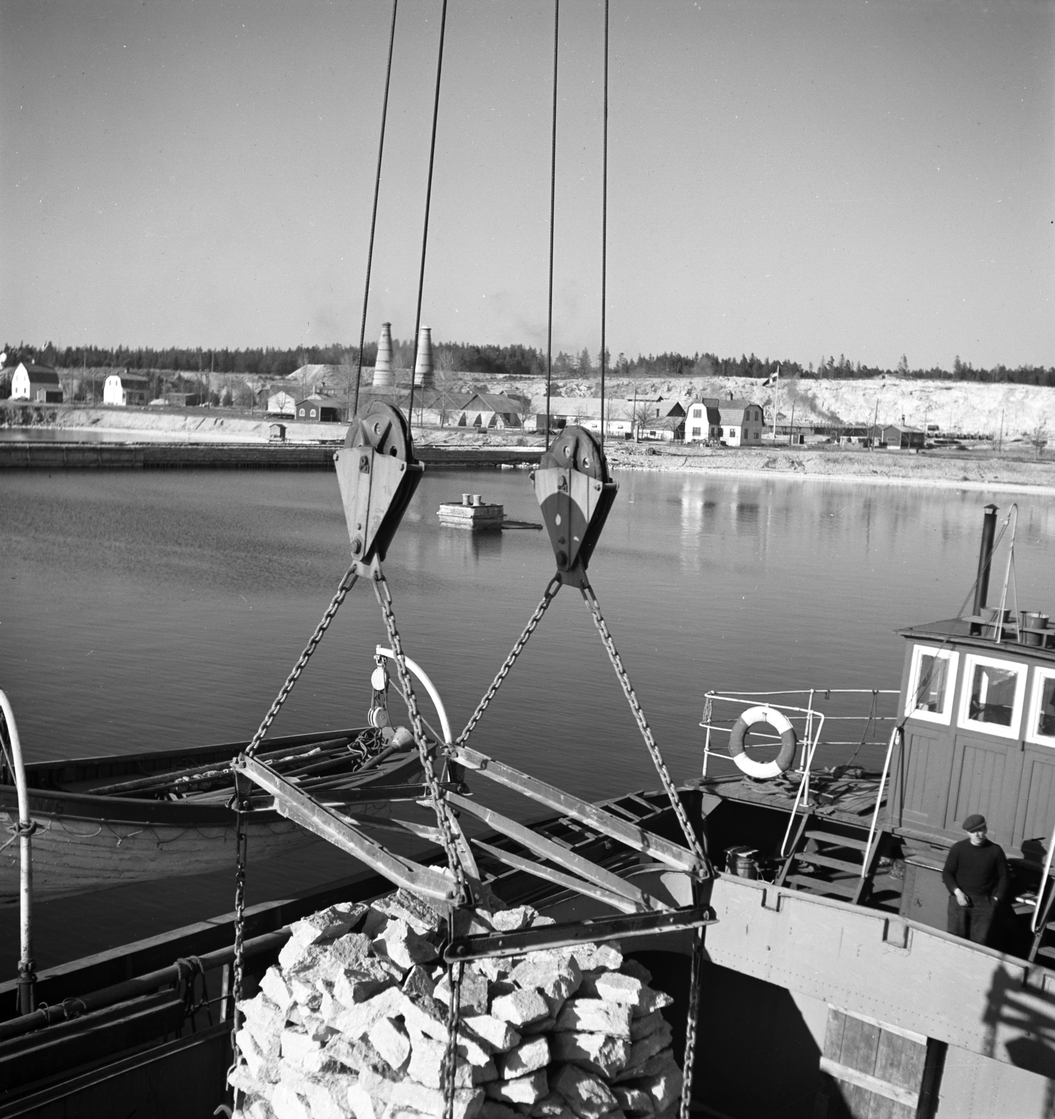 Beskrivning: Lastning av kalk från Bungenäs. Bilden troligen från omkring 1940.