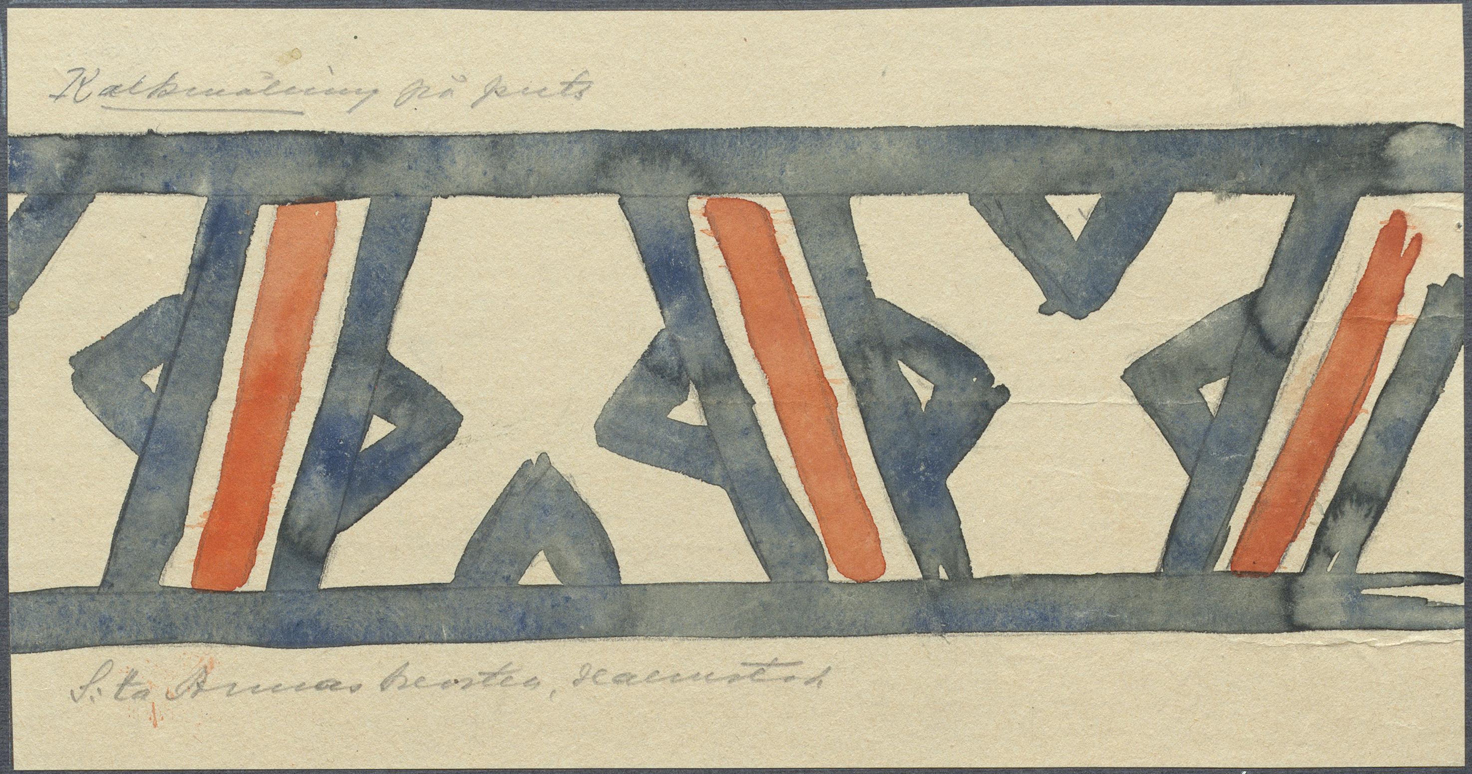 Beskrivning: RAÄ-nr: Halmstad 12:1. Kalkmålning på putsfragment från fransiskanerklostret S:ta Anna vid nuvarande Lilla torg i Halmstad. Akvarell av Erik Salvén 1937.