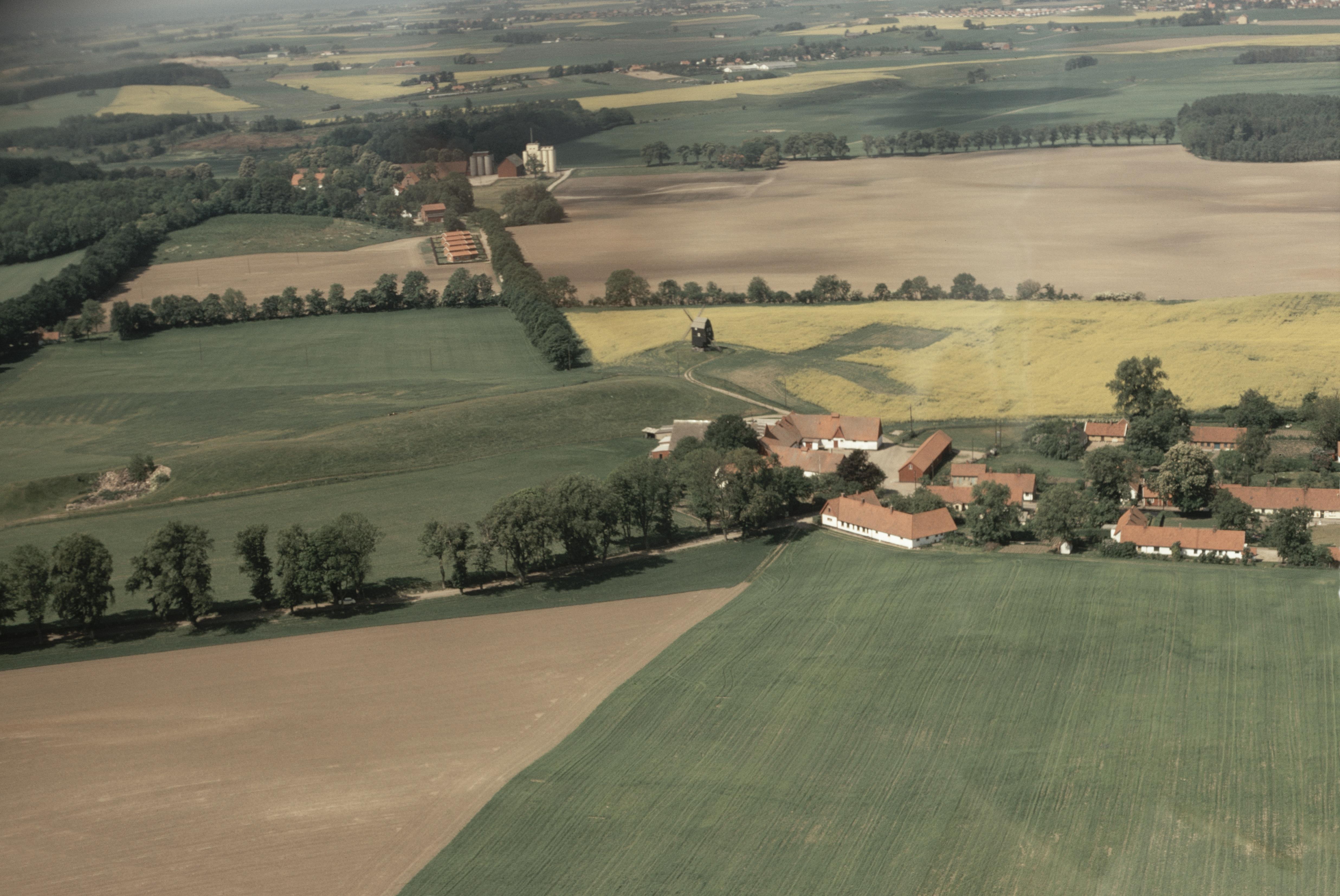 Beskrivning: Skabersjö kyrkby. Väderkvarn vid bildens mitt. Till vänster i bildens övre del Skabersjö slott. Bilden är tagen mot (väderstreck): SV