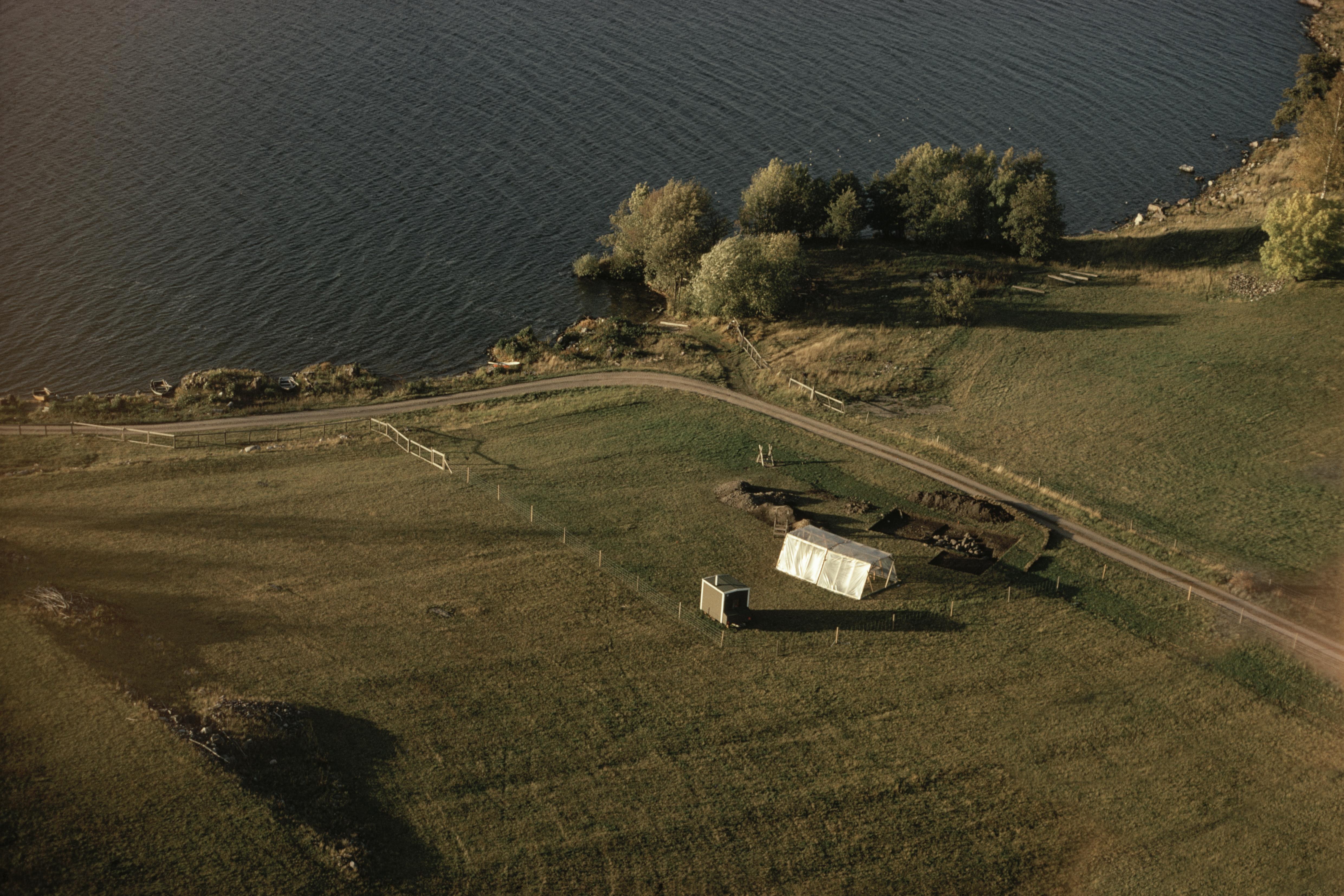 Beskrivning: Fornlämningsområdet Birka på Björkö i Mälaren. Arkeologisk undersökning i norra delen av ön i området Hemlanden och Svarta jorden RAÄnr Adelsö 118:1 vid Stadsvallen Adelsö 119:1-2. Bilden är tagen mot (väderstreck): NNV