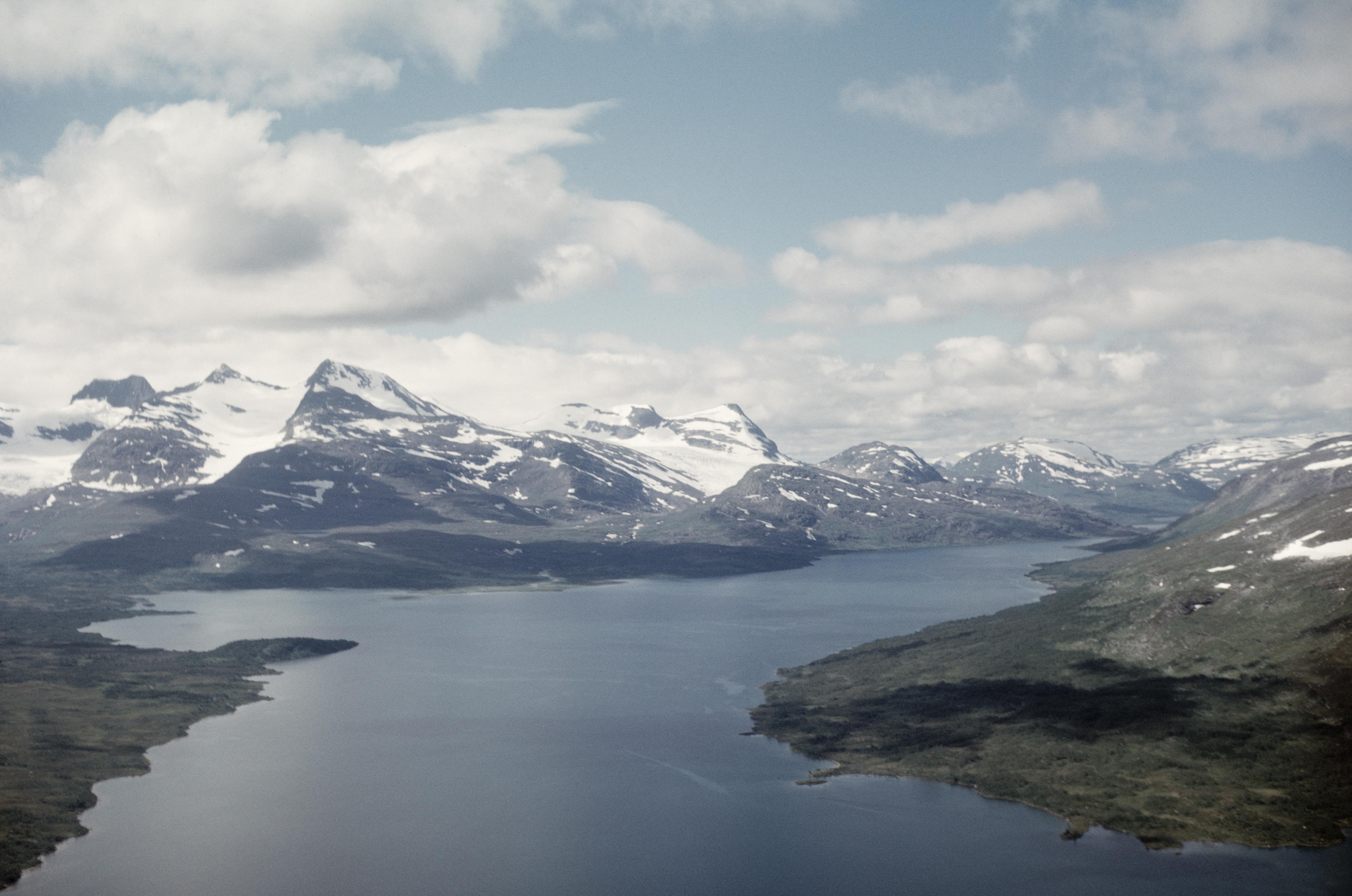 Beskrivning: Gräsvattnet från svenska sidan i öst mot den norska sidan i väst. Under bildens mitt går gränsen mellan Sverige - Norge. Uddarna vid bildens mitt och fjällen Okstindene är i Norge. Vid stranden nere i vänstra hörnet boplats RAÄnr Tärna 80:1, 82:1 m.fl. Bilden är tagen mot (väderstreck): VNV