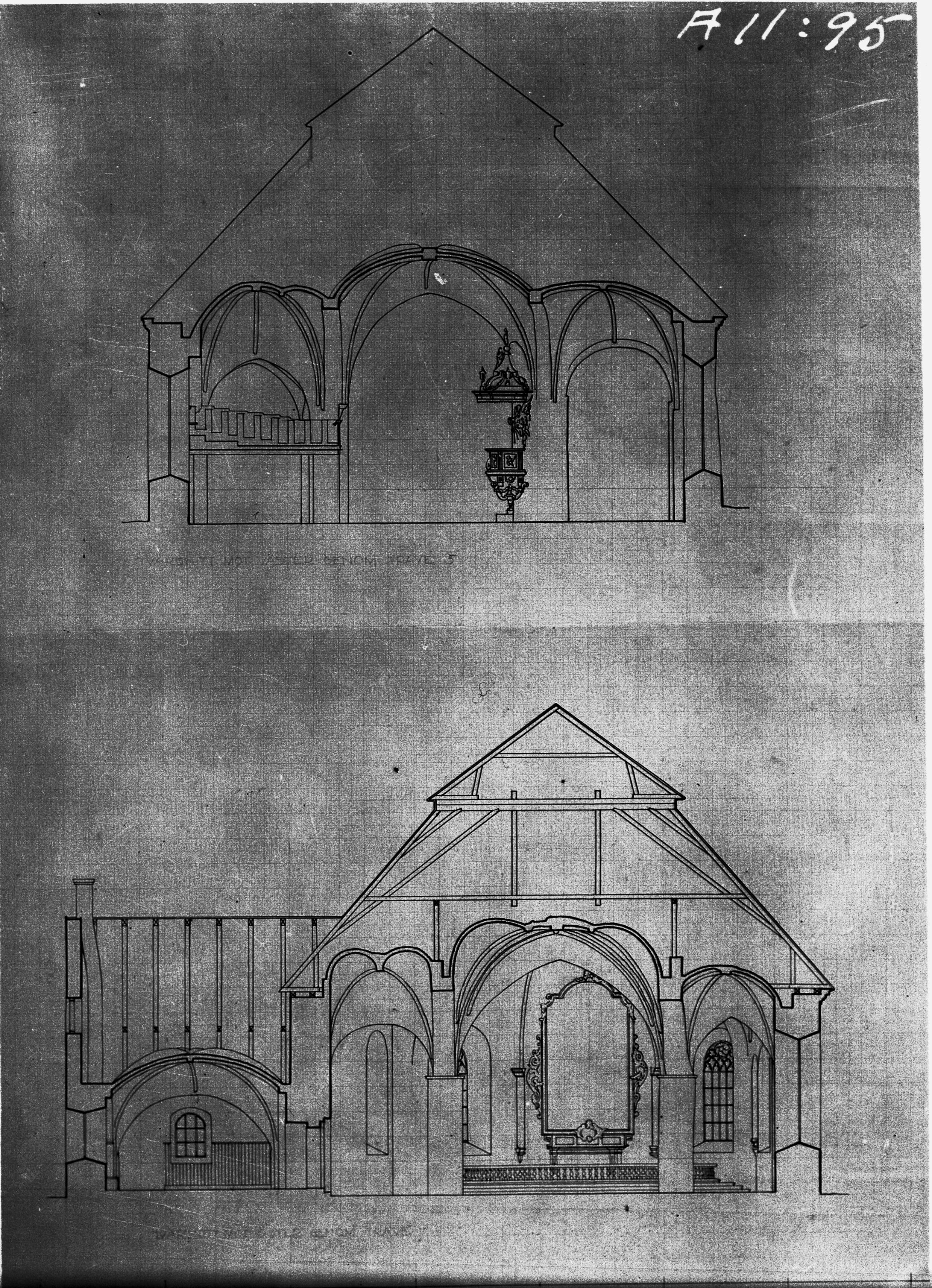 Beskrivning: Foto av ritning av genomskärning av kyrkan. Ur Sigurd Curmans samling.