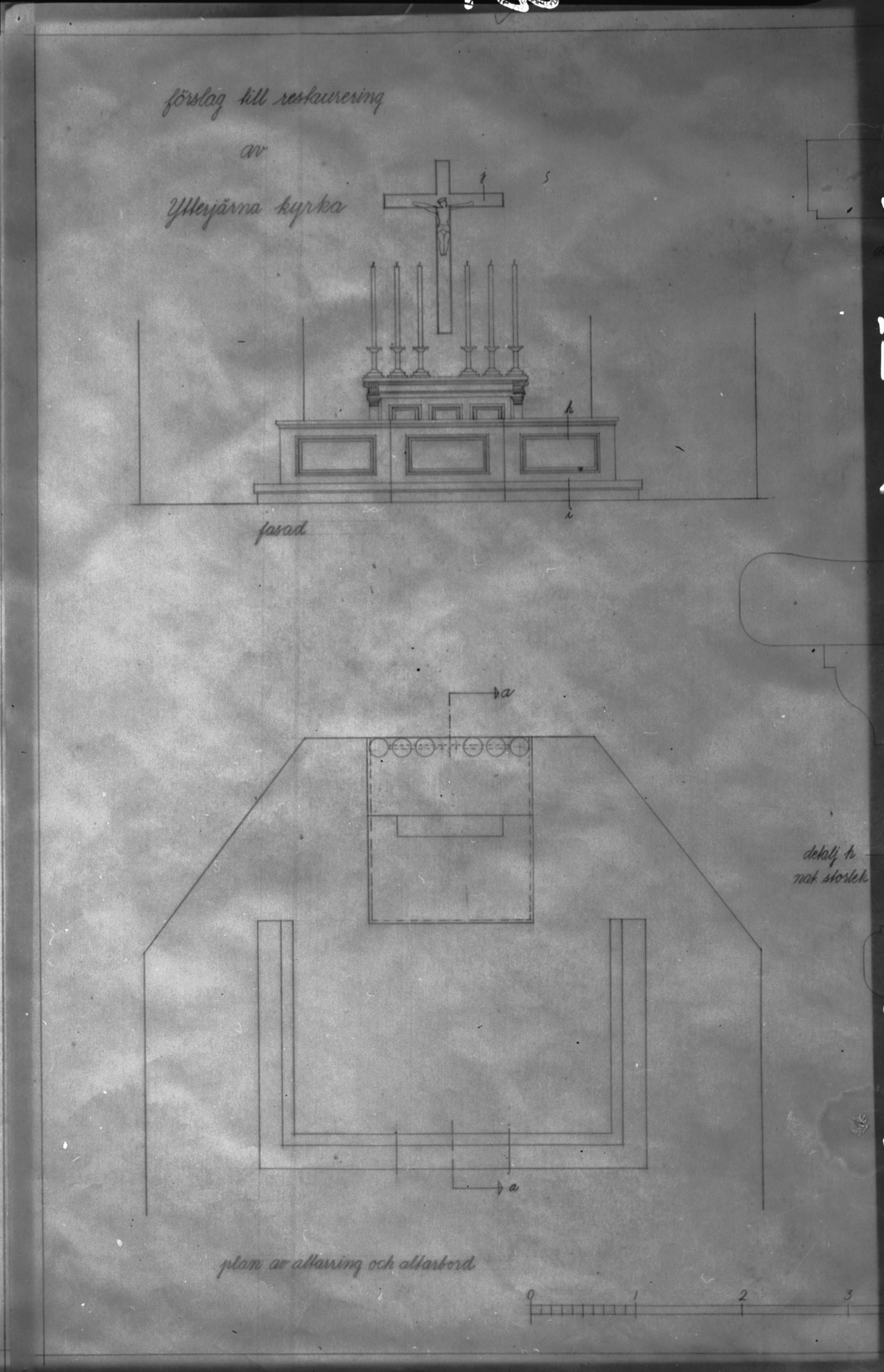 Beskrivning: Ritning, kor, mot öster samt planritning. Foto efter ritning.