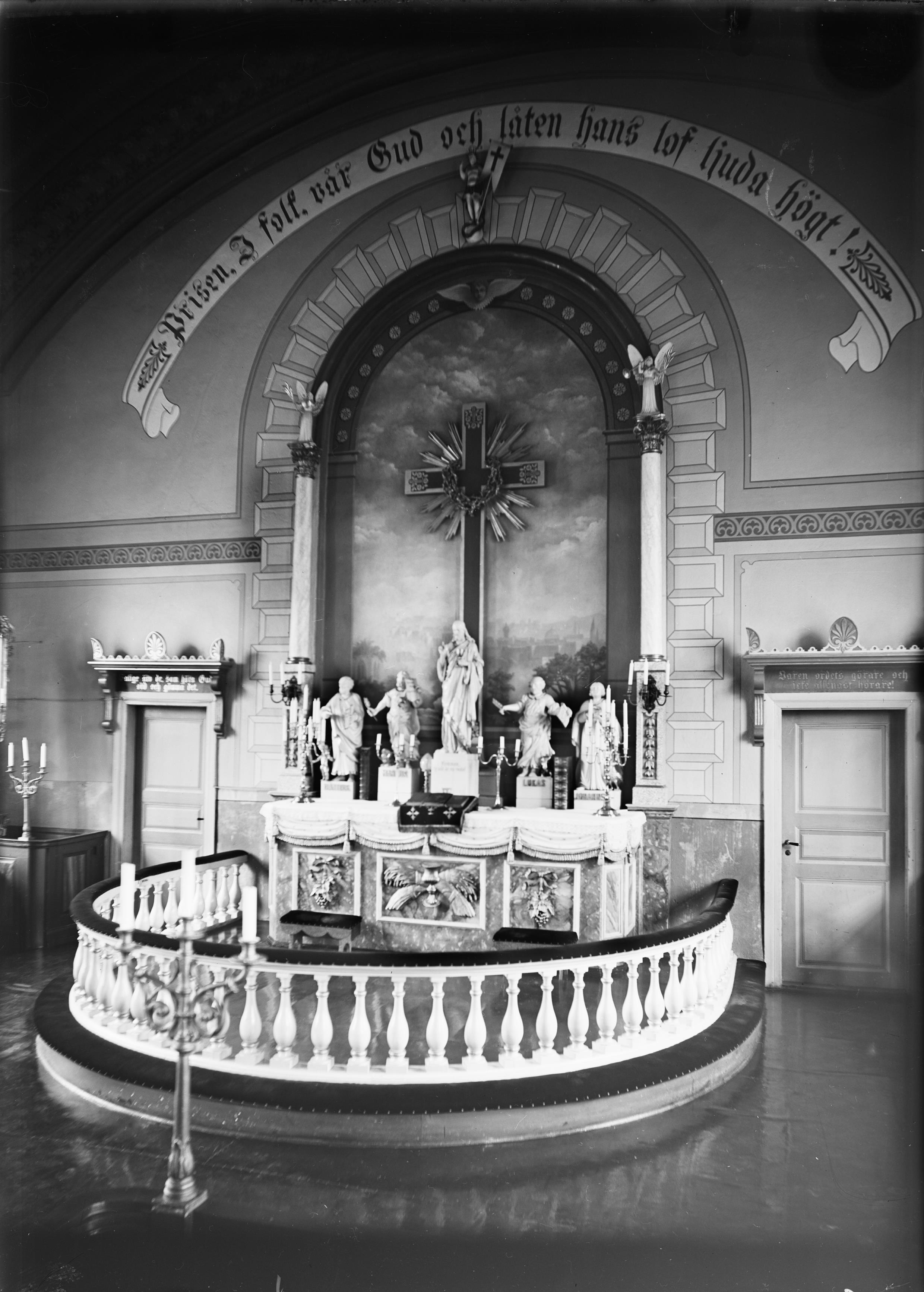 Beskrivning: Altare med altaruppsats från 1900, före restaurering.