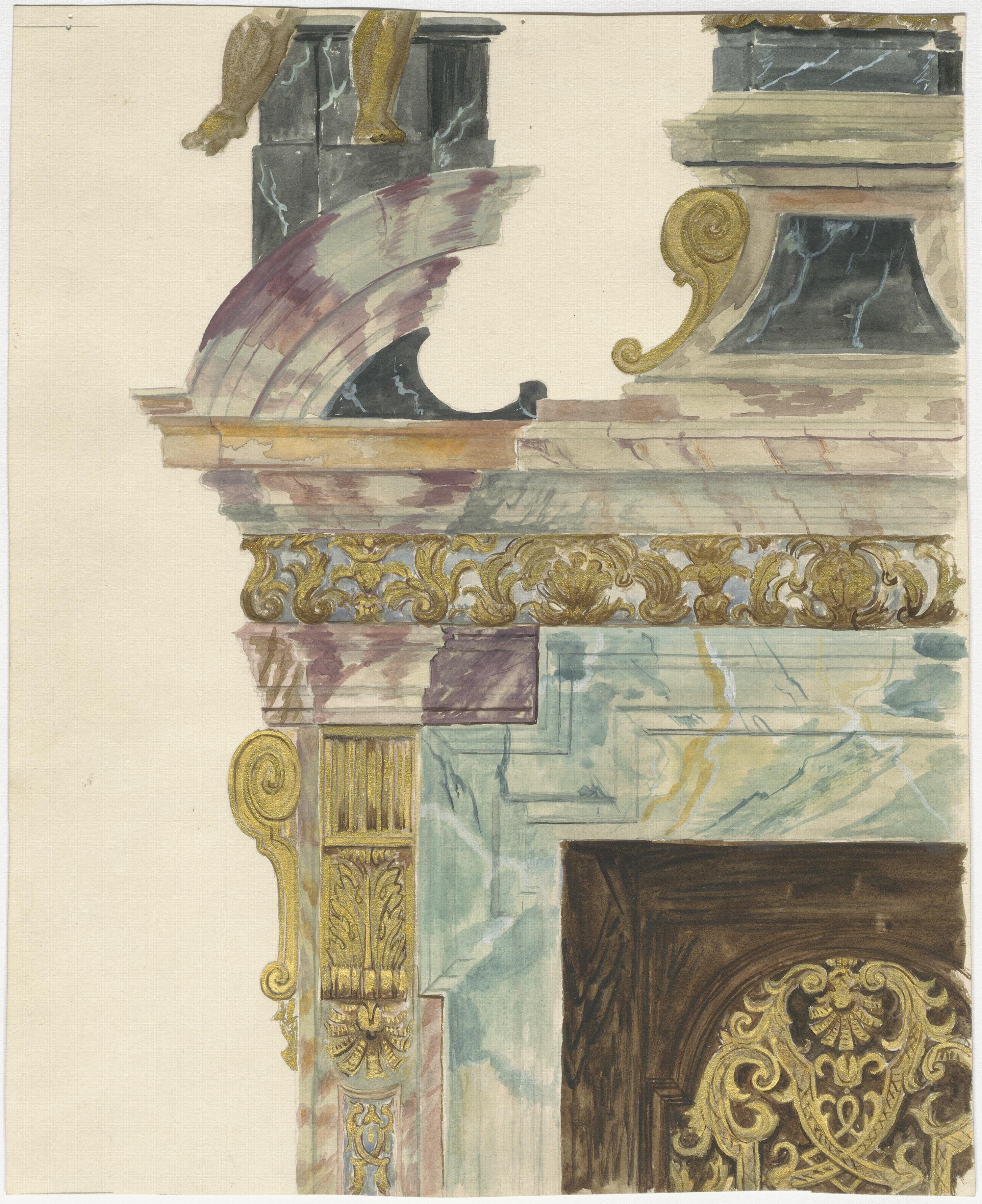 Beskrivning: Detalj av trappan till predikstolen från ca 1710. Akvarell av Robert Nilsson från 1936.