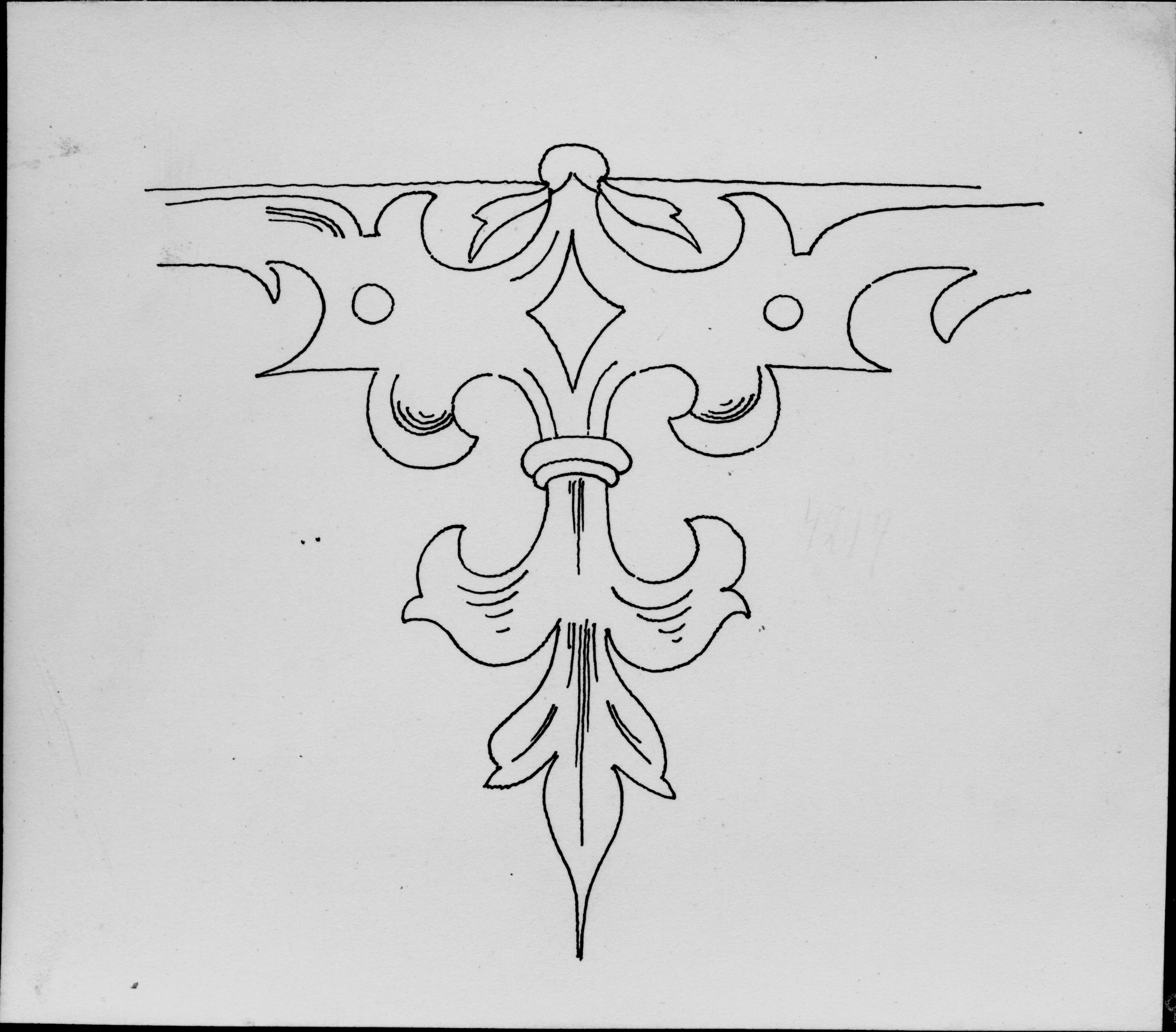 Beskrivning: Kalk, förgyllt silver, 1500-talet, detalj, ornament. Teckning av A. Liljenqvist 1912.