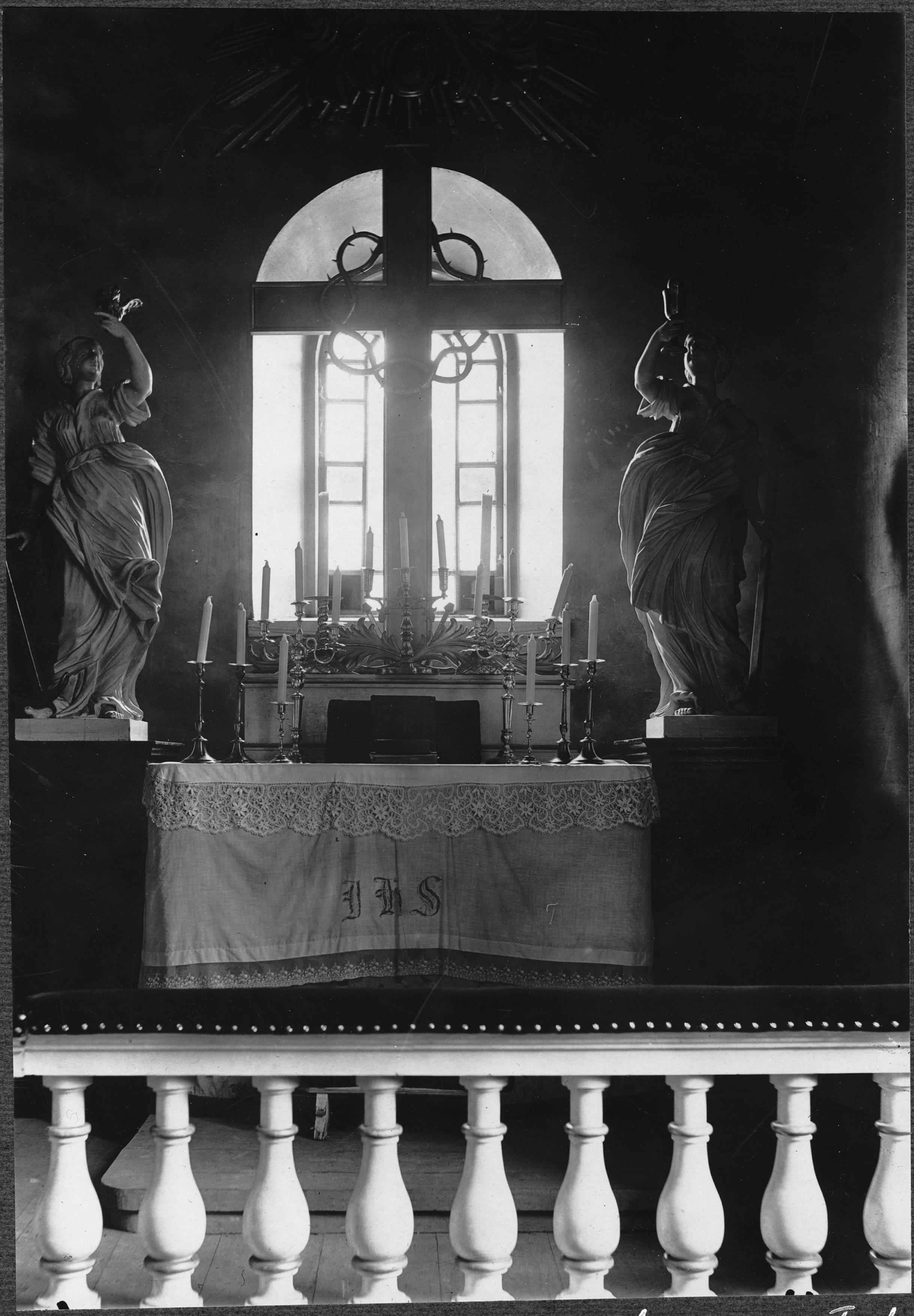 Beskrivning: Altaret flankerat av två altarprofilörer: Tron och Hoppet, vitmålat trä med förgyllda attribut, Magnus Granlund 1766-68.