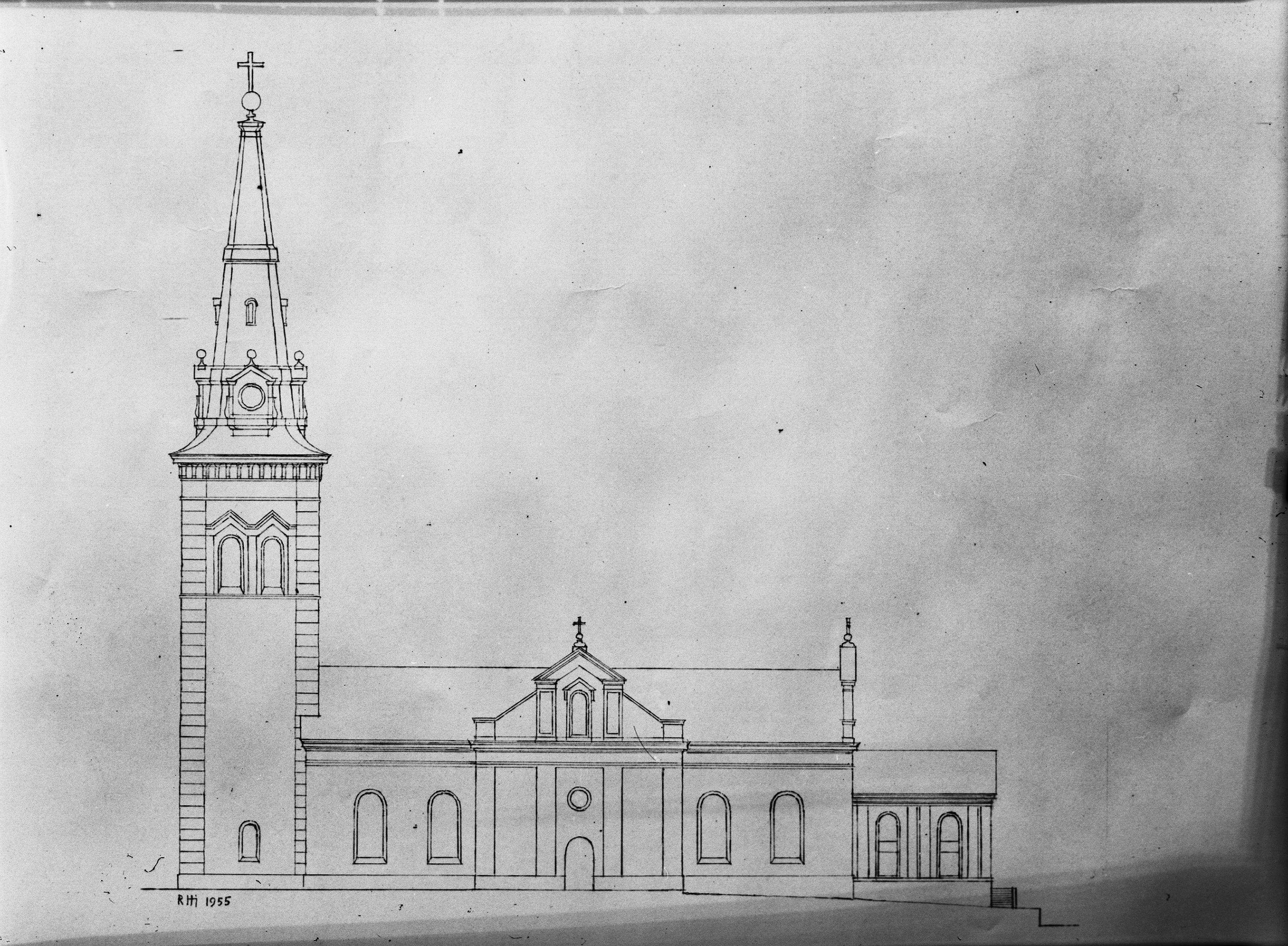 Beskrivning: Kyrkan mot söder. Fasadritning av Ragnar Hjorth, 1955. Avfotograferad.