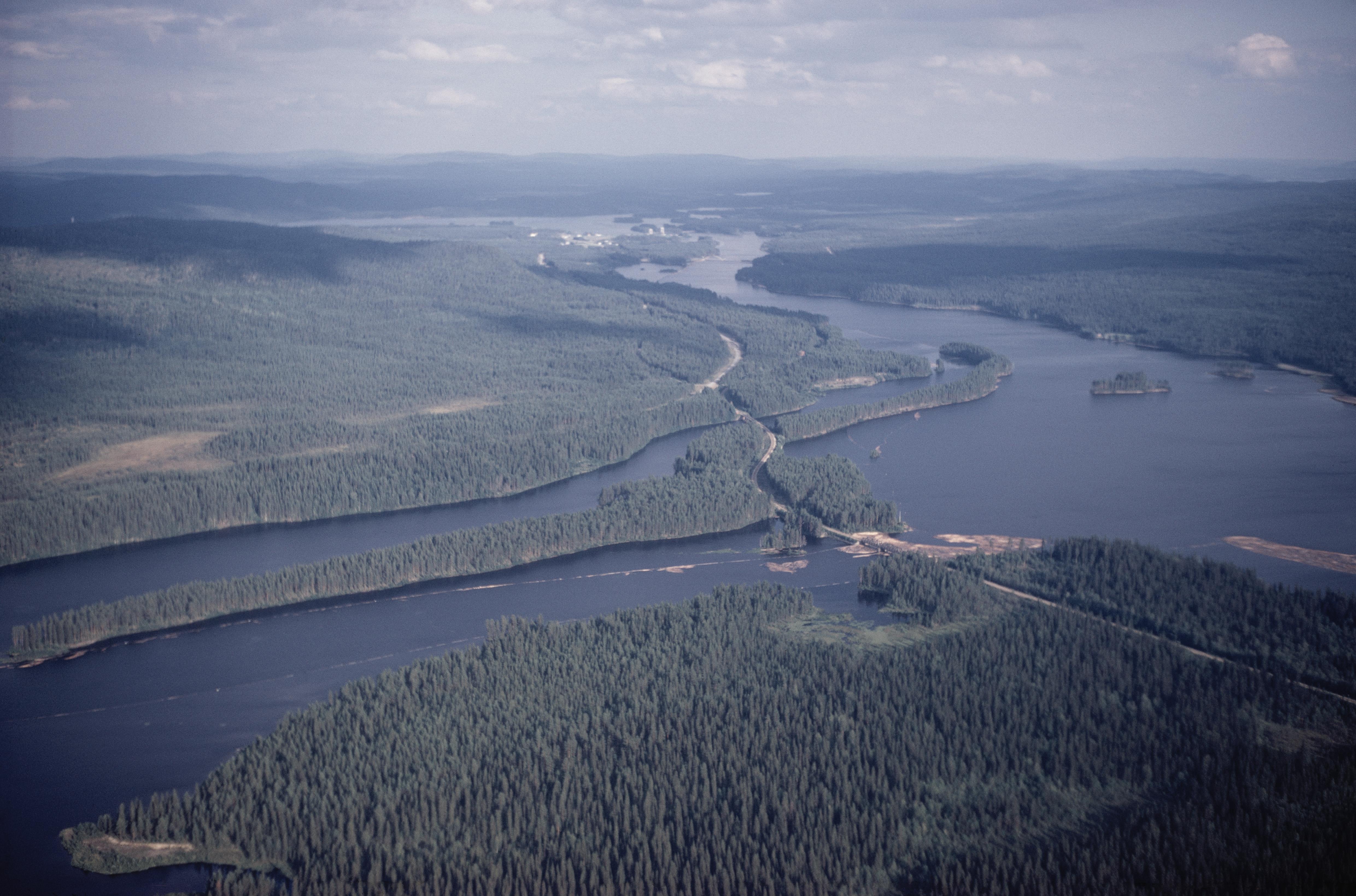 Beskrivning: Tåsjöån (till vänster) och Flåsjöån (nere till höger) möter Grundfjärden i nordvästra delen av Hotingssjön (skrivs även Hotingsjön). Längs bildens mitt Långön med fångstgrop RAÄnr Tåsjö 182:1, boplats Tåsjö 250:1, gravfält Tåsjö 155:1 m.fl. Bilden är tagen mot (väderstreck): OSO