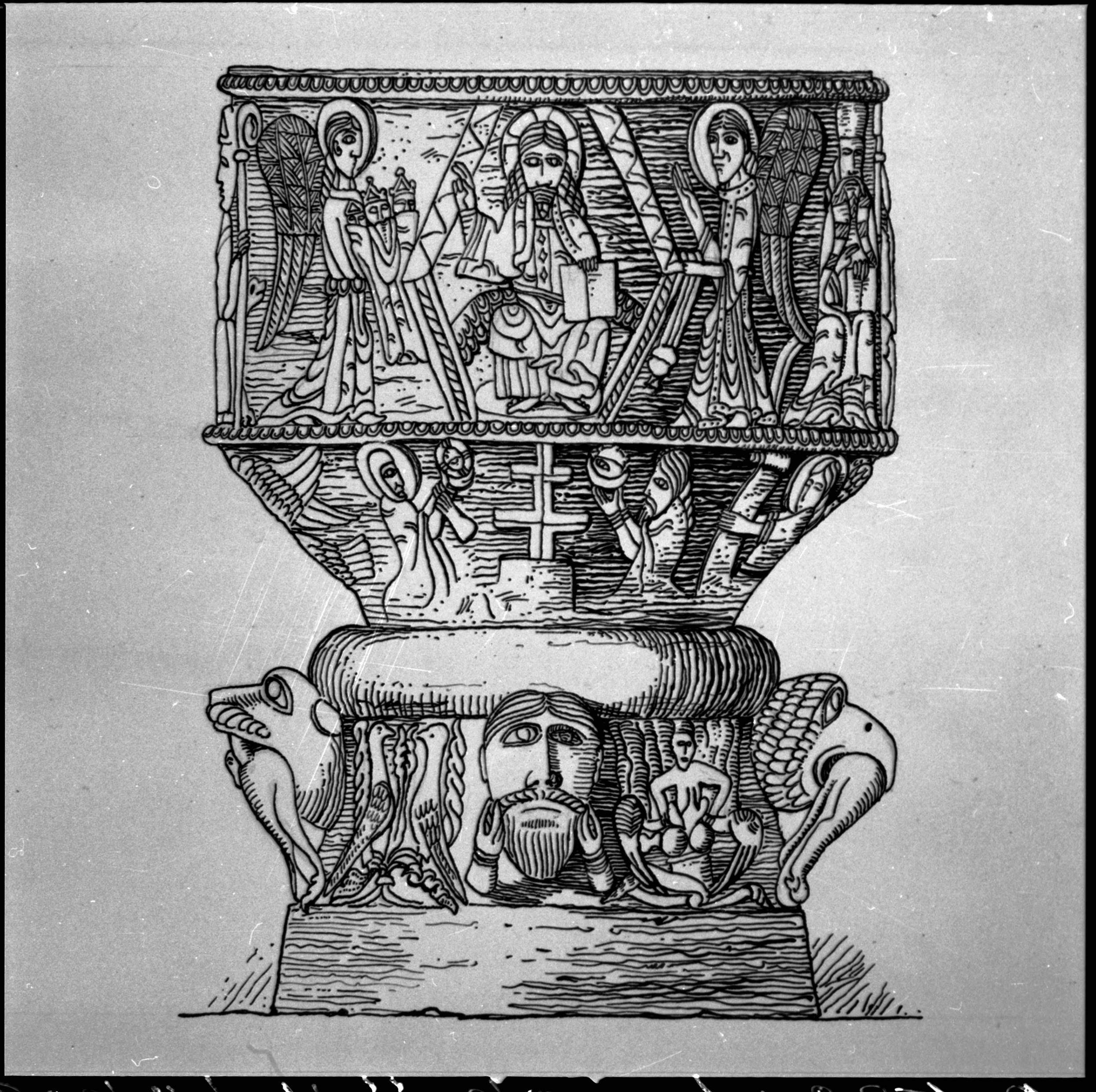 Beskrivning: Dopfunt av sandsten, cylindrisk, av Magister Majestatis, 1100-talet. Foto efter teckning. Uppmätt av Sten Anjou. Original i Handteckningssamlinge, ATA.