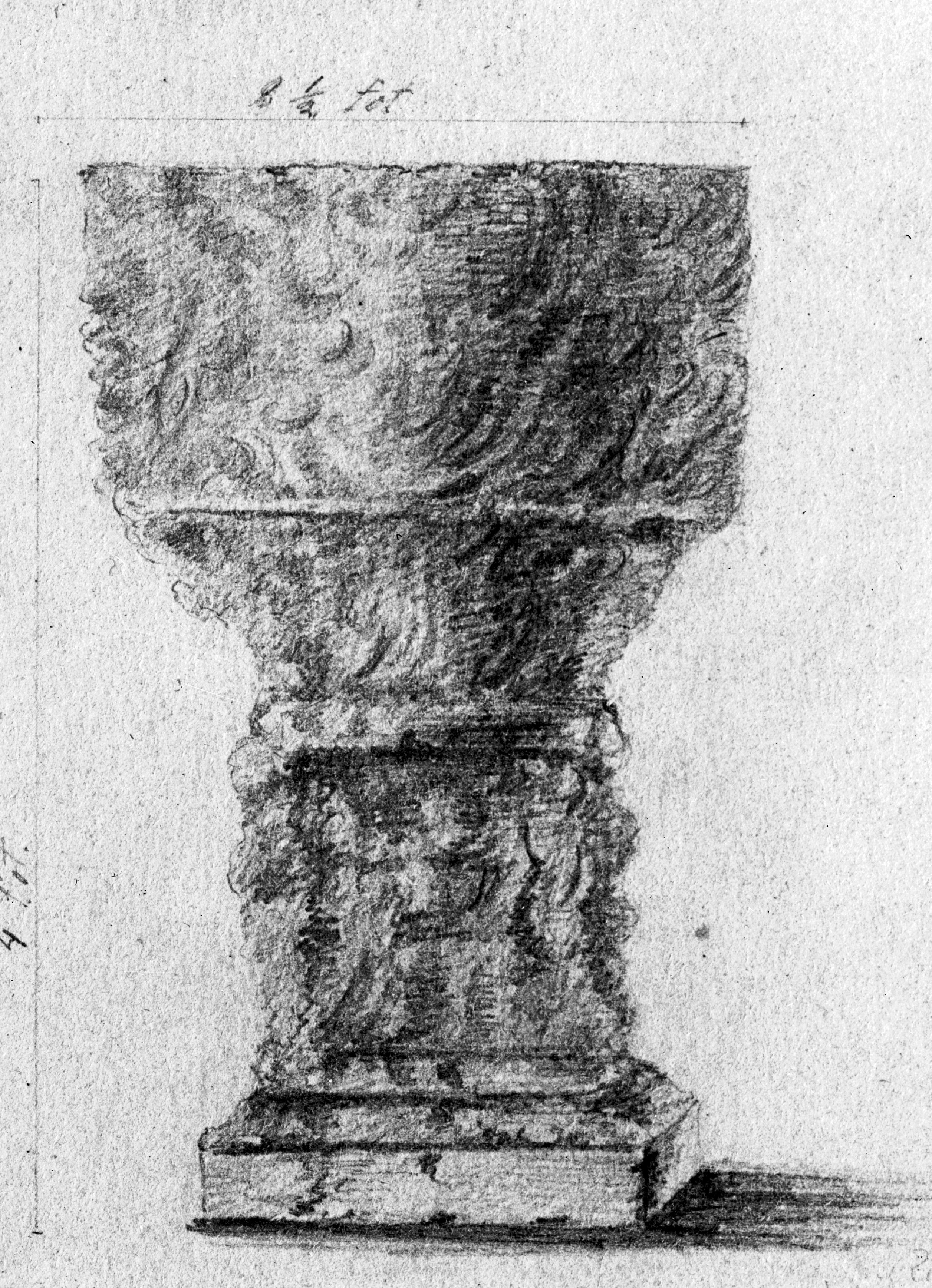 Beskrivning: Dopfunt av sandsten. Under 1800-talet starkt vittrat och förstördes vid branden 1904. Foto efter teckning.