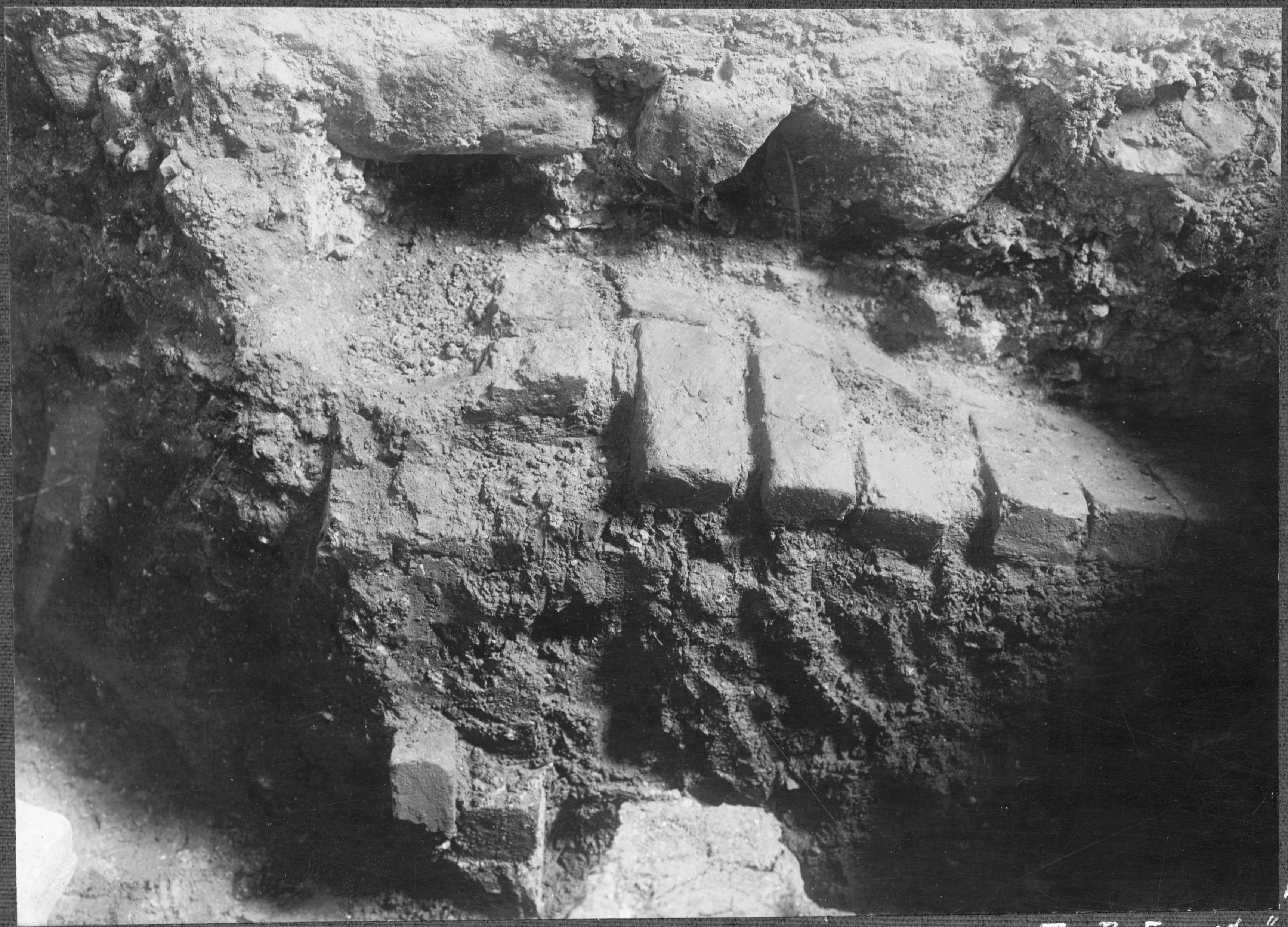 Beskrivning: Vågrätt lagda tegelstenar under altaret. Från väster.