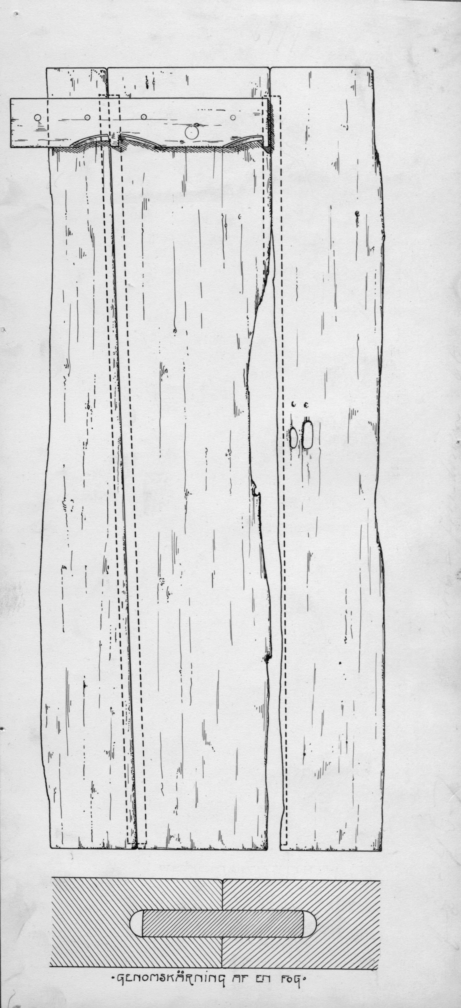 Beskrivning: Ritning av kyrkdörr av trä med beslag samt genomskärning av en fog.