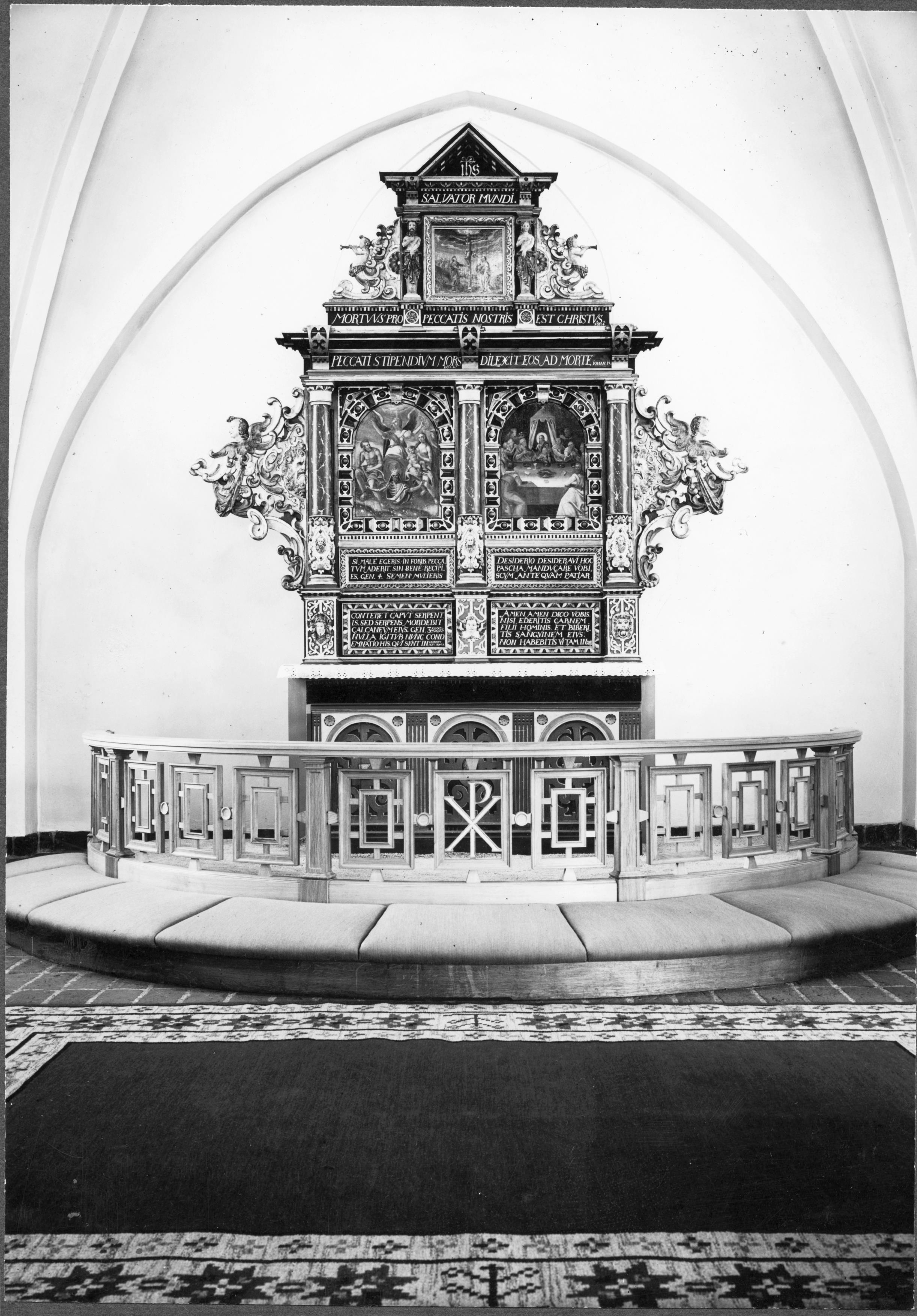 Beskrivning: Altare, troligen från 1624. Altarring från 1953.