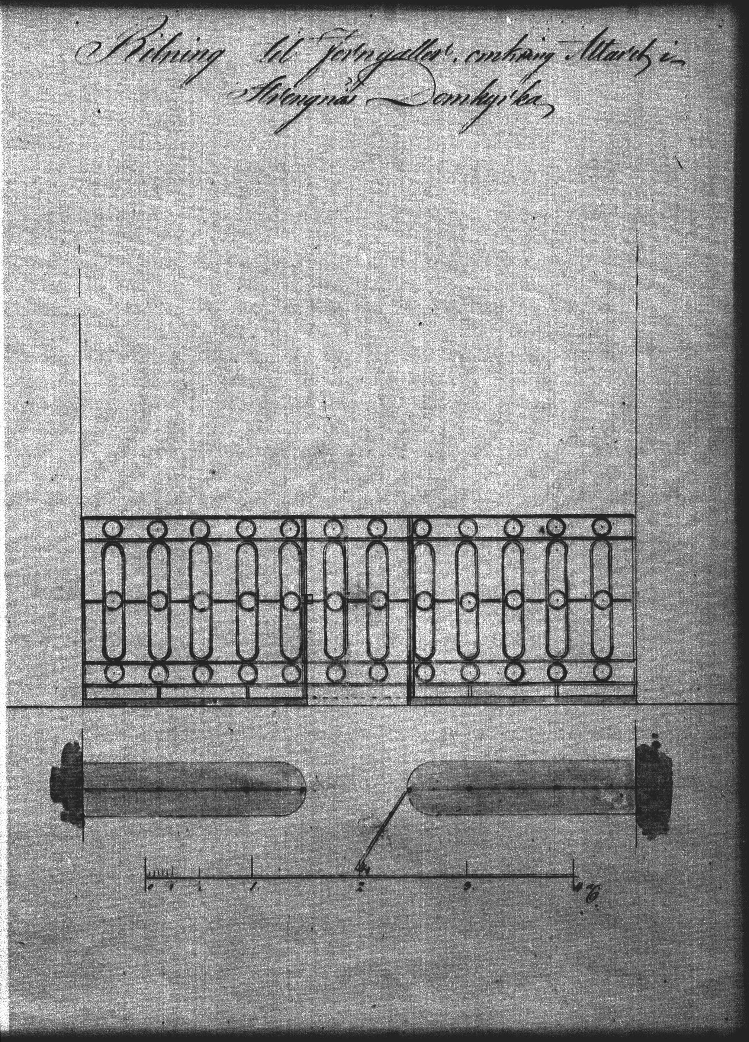 Beskrivning: Altare, ritning till järngaller runt altaret, avfotograferad, efter ritning i Stockholms stadsarkiv.