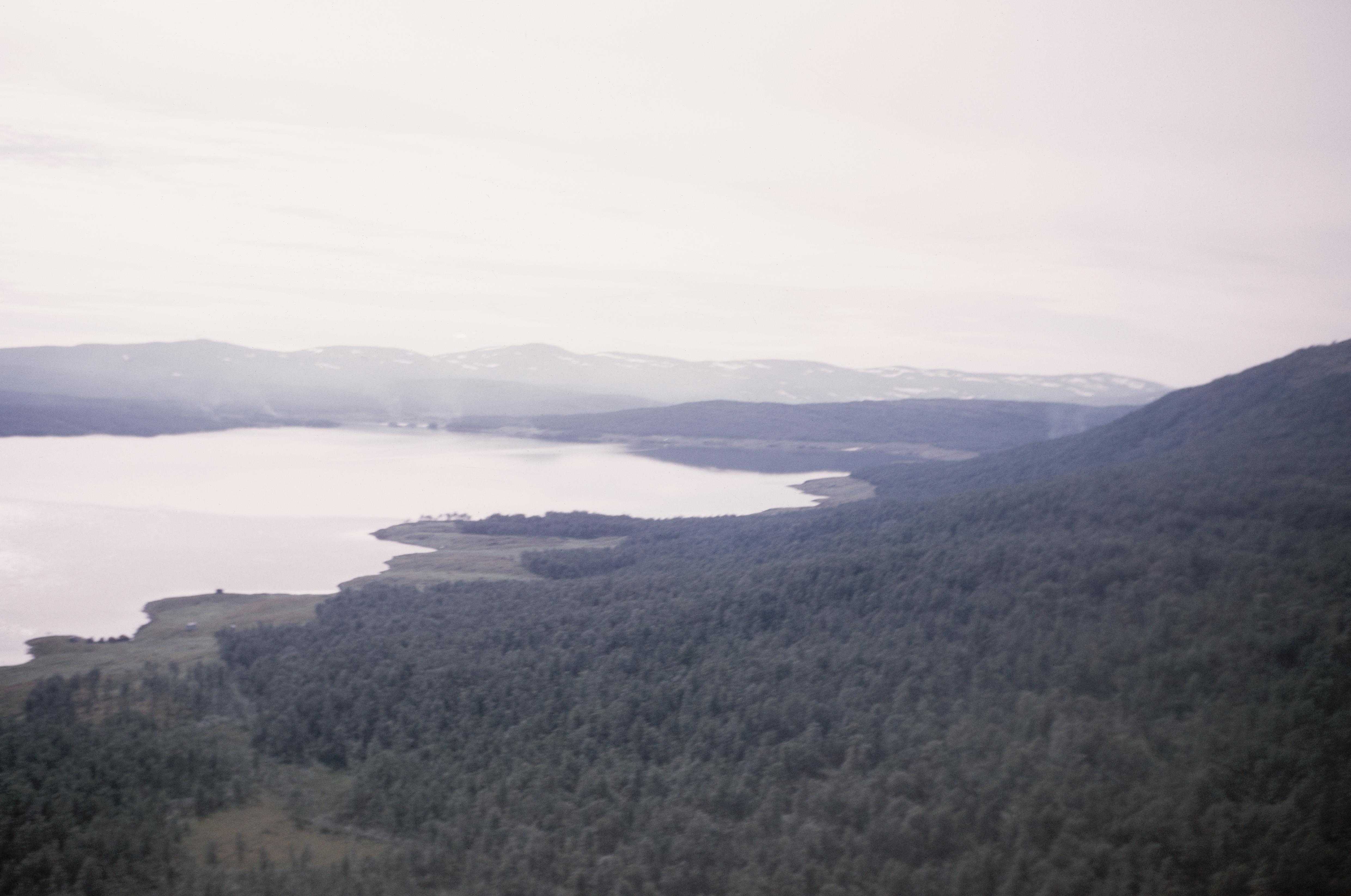 Beskrivning: Abelvattnet innan sjöregleringen / uppdämningen. Abelvattnets östra del (Jillie Aapije). I bildens nedre del områdena längs södra stranden. Uppe till vänster fångstgropar RAÄnr Tärna 130:1 vid Gejmån och utloppet mot sjön Bleriken. Bilden är tagen mot (väderstreck): ONO