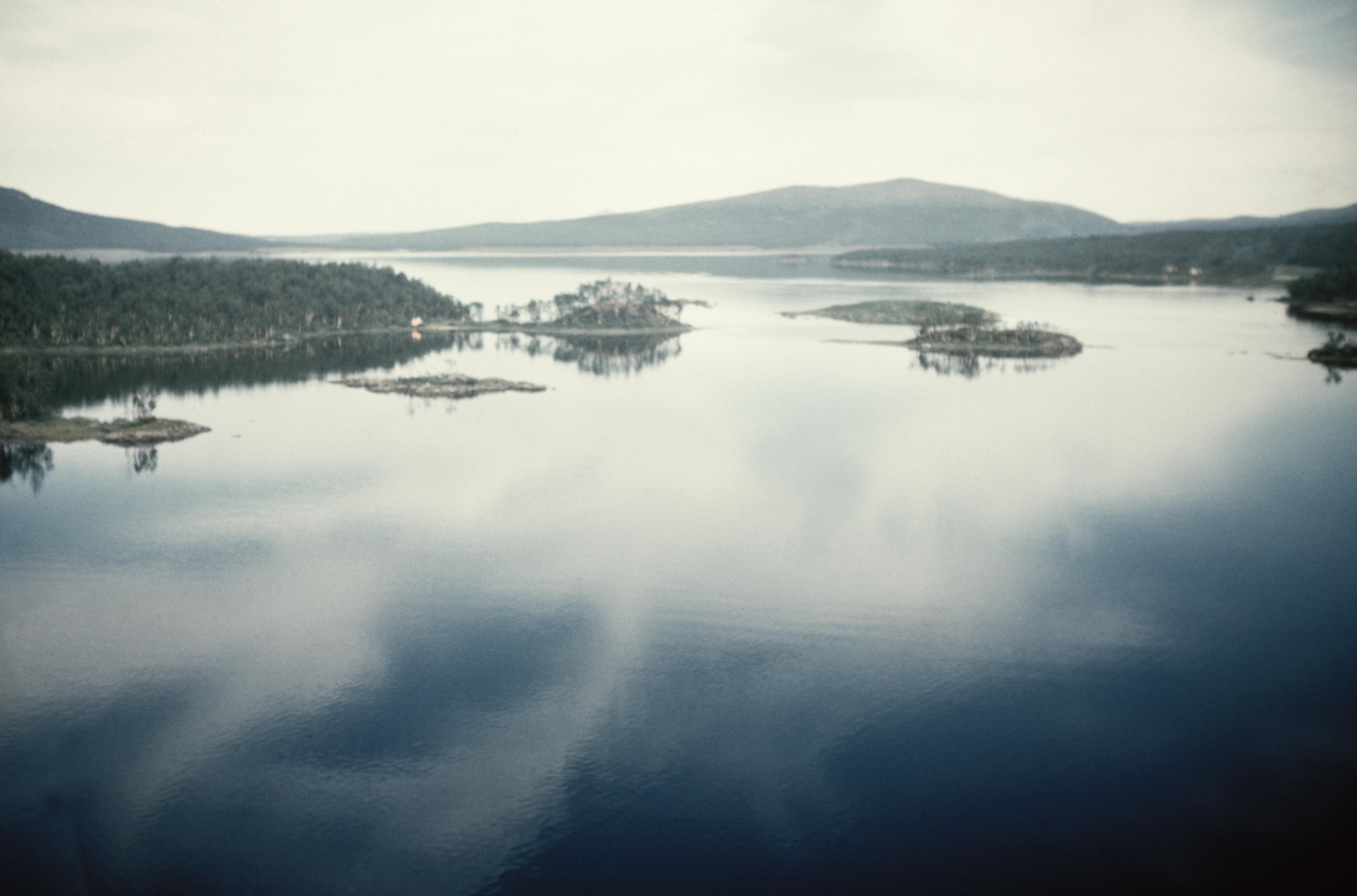 Beskrivning: Abelvattnets västra del (Jillie Aapije). innan sjöregleringen / uppdämningen. Dämningsröjning med vegetationsbränder har påbörjats. Uppe till vänster udden Tjuvvelge. Över bildens mitt Mittisundet (RAÄnr Tärna 125:1). I bildens övre del Abelvattnets östra del (Luvlie Aapije). Bilden är tagen mot (väderstreck): Ö