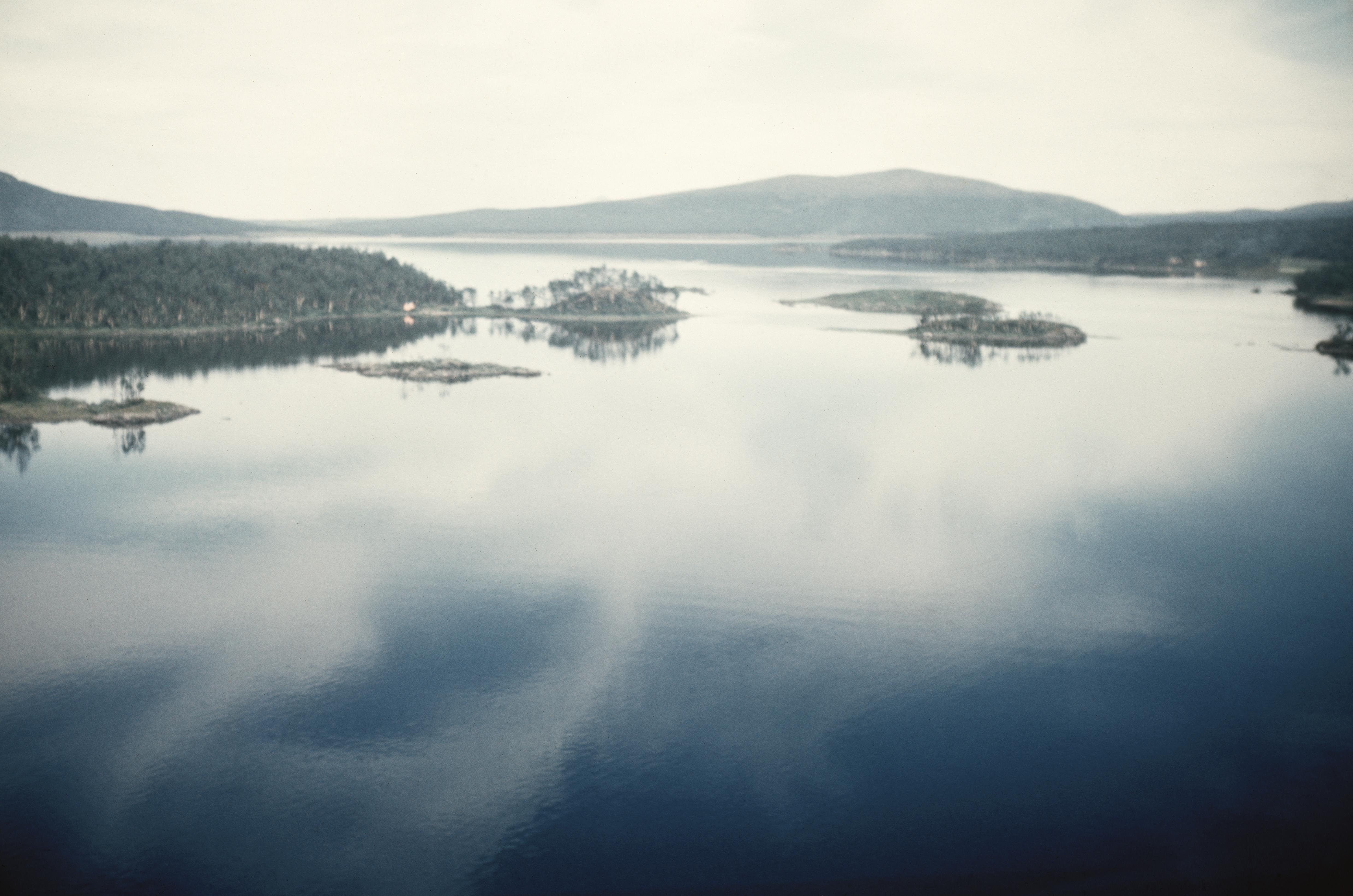 Beskrivning: Abelvattnets västra del (Jillie Aapije). innan sjöregleringen / uppdämningen. Dämningsröjning med vegetationsbränder har påbörjats. Uppe till vänster udden Tjuvvelge. Över bildens mitt Mittisundet (RAÄnr Tärna 125:1). I bildens övre del Abelvattnets östra del (Luvlie Aapije). Bilden är tagen mot (väderstreck): Ö