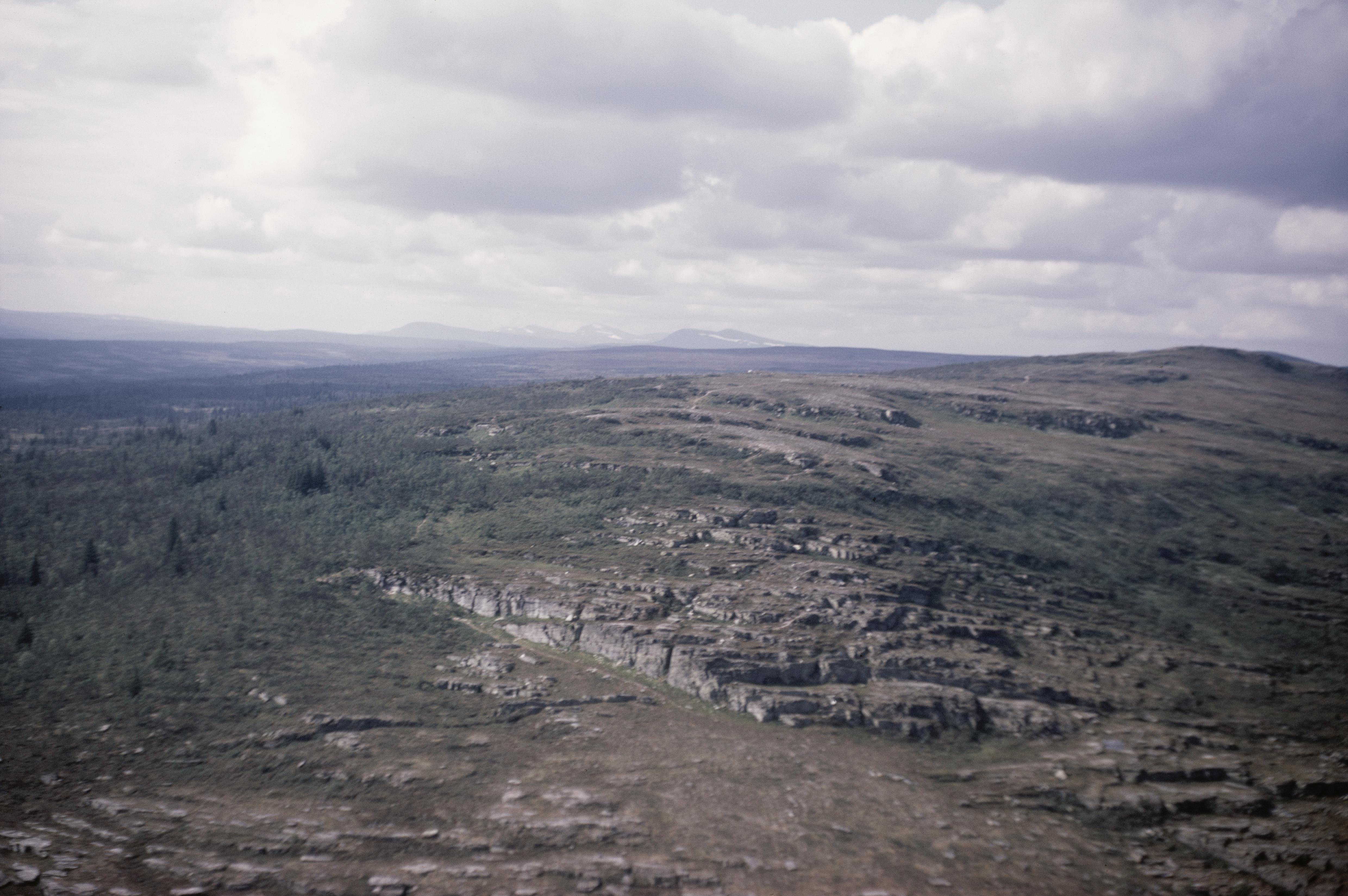 Beskrivning: Östra delen av lågfjället Flatruet (Fleete). Uppe till höger bergstoppen Ruändan (Sjnjaptjegietije). I bergsidan under bildens mitt en lodrätt klippvägg med hällmålningar RAÄnr Tännäs 58:1. Bilden är tagen mot (väderstreck): V